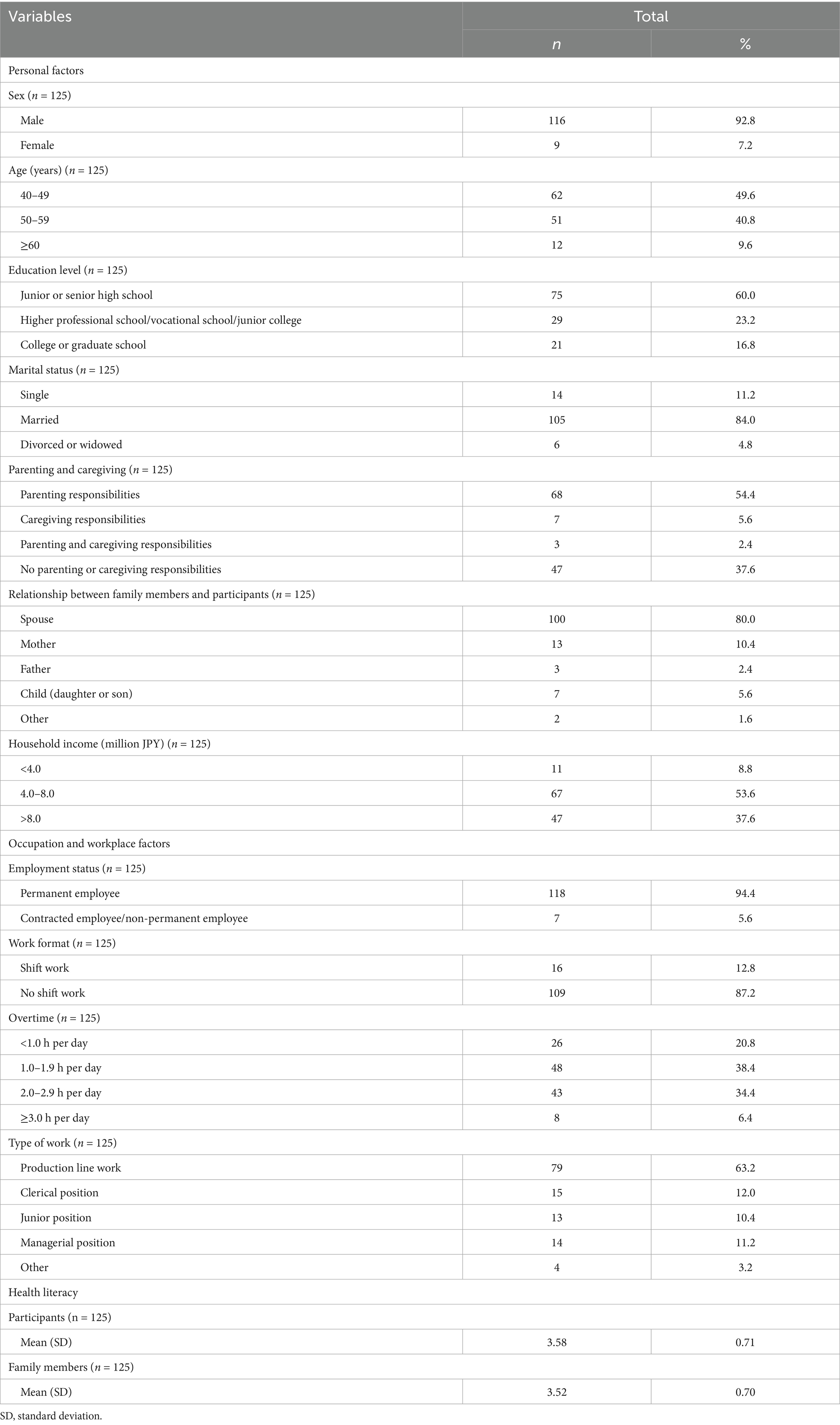 We conducted a survey using a self-administered questionnaire among the 275 included participants between September 9, 2024 and December 28, 2024. Self-administered questionnaires, instructions and information about participation in this study, and return-mail envelopes were sent to the home of these 275 participants on September 9, 2024 by the health insurance society. The questionnaire was sent again on October 10, 2024 to participants who had not returned a completed questionnaire to their employer. Participants and their family members (members of the participants’ family who were living in the same household and most supportive of participants’ health care) provided written informed consent via the self-administered questionnaires. Through December 28, 2024, a total of 165 out of 275 participants returned a completed questionnaire to the health insurance society (response rate, 59.9%). Among these 165 participants, 134 lived with family members; 125 family members of participants completed the questionnaire (response rate, 93.3%). Thus, 125 participants and 125 family members were included in the analysis.