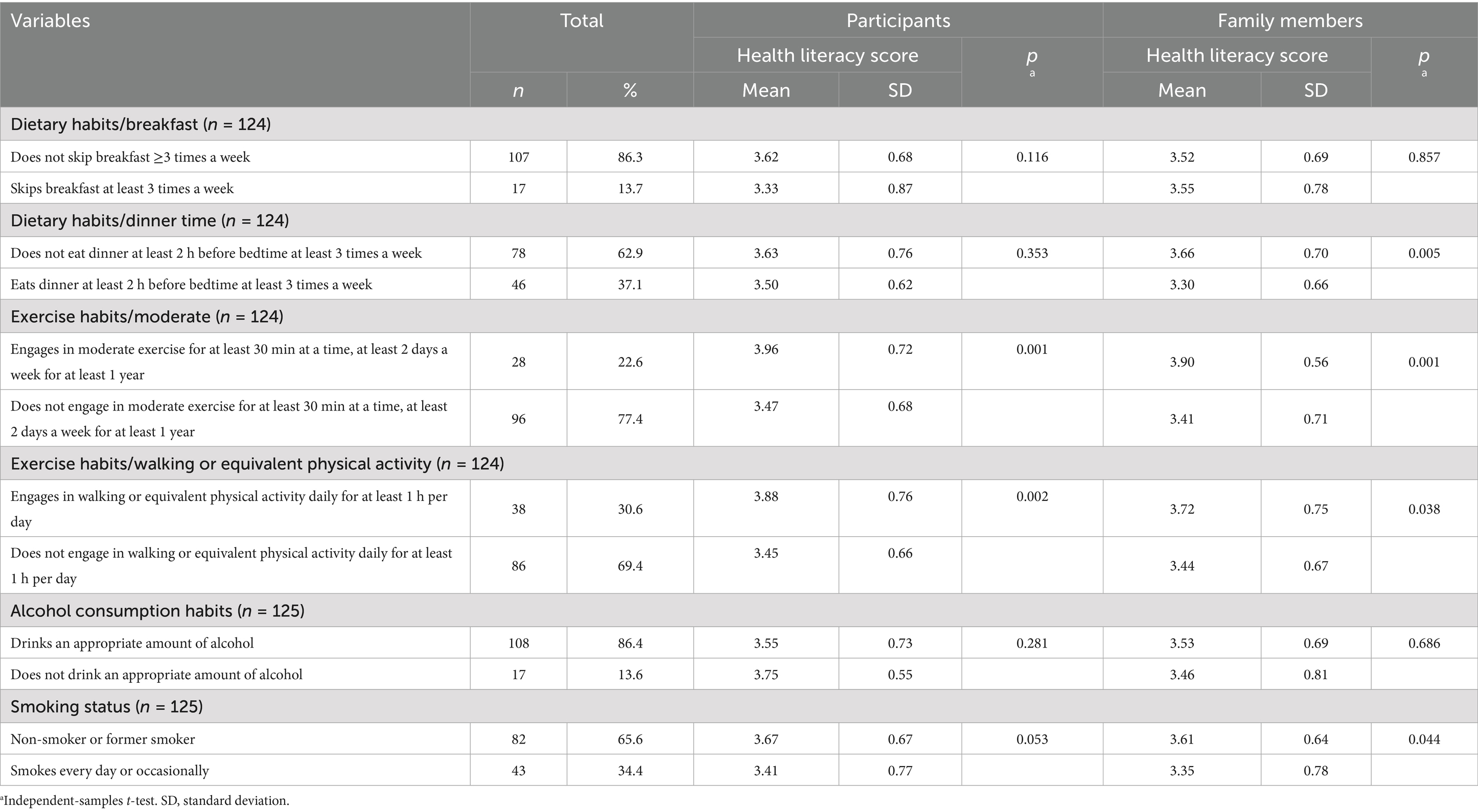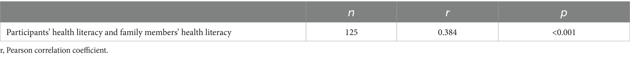 Table 4. Associations between participants’ lifestyle habits and health literacy of participants and their family members (n = 125).