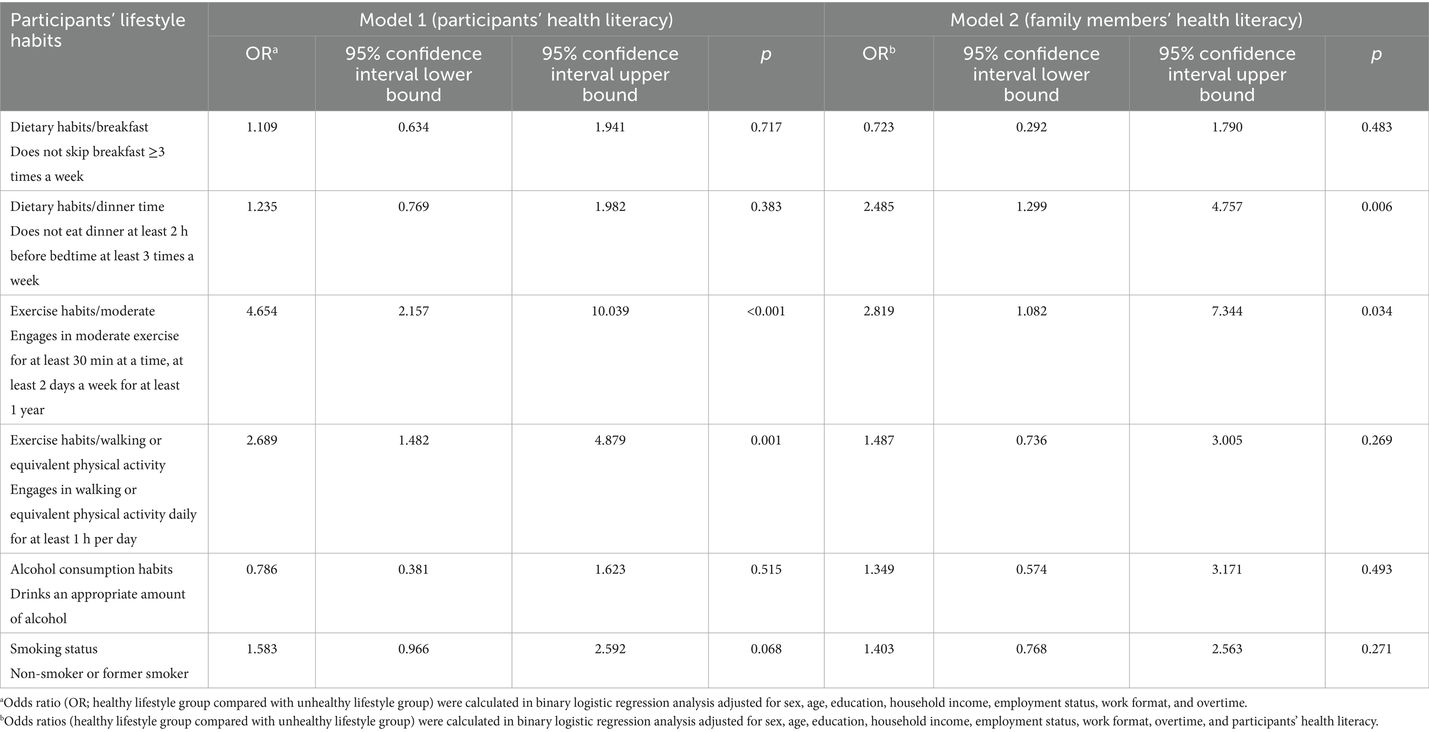 Methods: We conducted a cross-sectional observational study at a Japanese machine manufacturing company using a self-administered questionnaire. Participants were recruited by the health insurance society based on the criterion of specific health guidance; and participants’ family members were also included in this study. Participants’ lifestyle habits were assessed on the basis of specific health checkup questionnaires. Health literacy was assessed using the Communicative and Critical Health Literacy scale. We used two binary logistic regression models to examine the associations of participants’ lifestyle habits with the health literacy of participants and their family members.