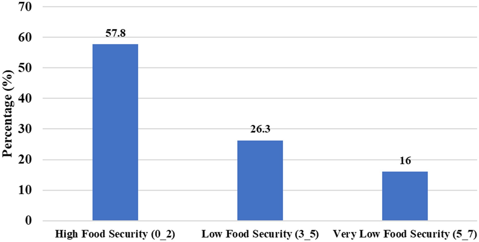 Data was analyzed using statistical software SPSS version 26. Descriptive analysis was used to represent the variables, where frequencies and percentages represented the qualitative variables, while continuous variables were represented by means, standard deviation, minimum, and maximum. The normality testing was checked graphically via histogram and QQ-Plot. The association between food security (High, Low) was tested with all the study variables (demographics, socioeconomic characteristics, mental health variables, and resilience). Chi-square test and independent t-test were used in the bivariate analysis. To assess the factors predicting low food security, a binary logistic analysis model was employed, including all the variables that were associated in the bivariate settings with p < 0.2. Standard assumptions for logistic regression, including assessment of multicollinearity among independent variables, were checked and no violations were detected. The survey was designed to require completion of all sections, so there was no missing data and no imputation was necessary. Statistically significant associations were set at 5% (p < 0.05).