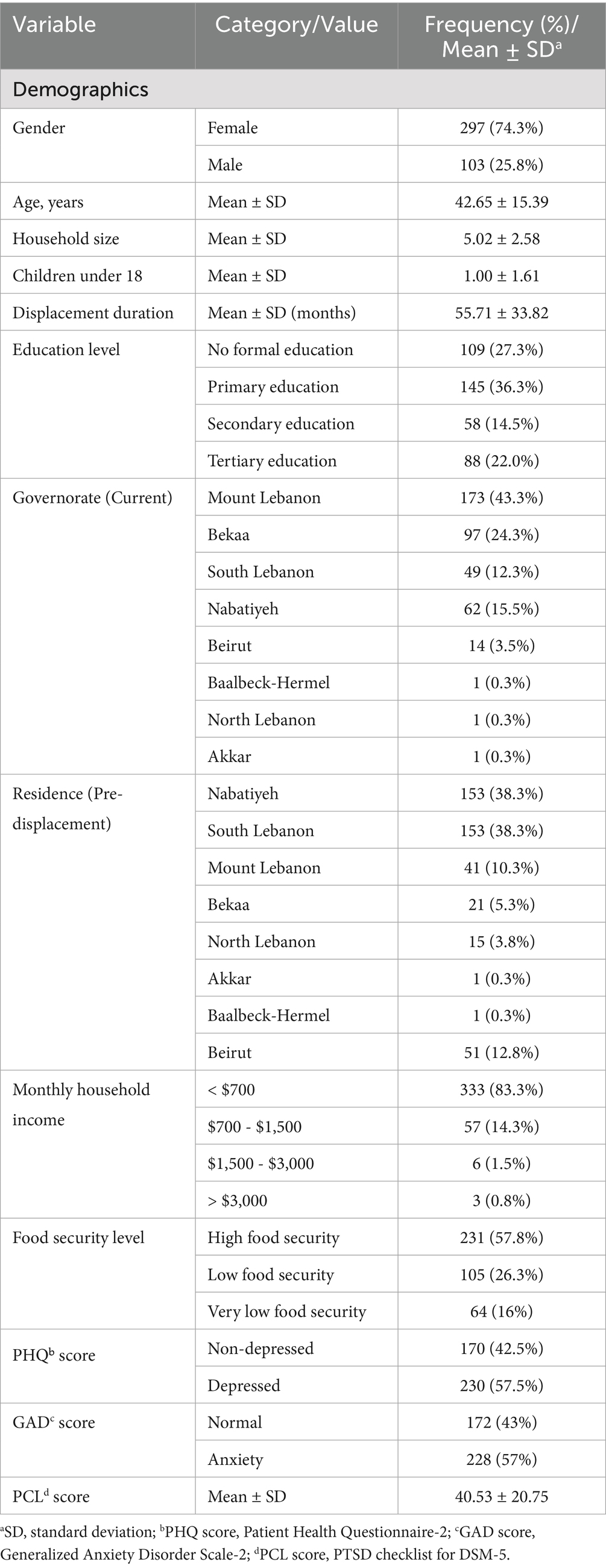 Table 1 describes the baseline characteristics of the study population. A total of 400 participants were recruited, predominantly female (74.3%), with a mean age of 42.7 ± 15.4 years (range 18–95). Most participants had low educational attainment (27.3% no formal education; 36.3% primary; 14.5% secondary; 22.0% tertiary). The mean household size was 5.0 ± 2.6 members, including on average one child under 18. Households reported an average displacement duration of 55 months. Participants were mainly from Mount Lebanon (43.3%), Bekaa (24.3%), and South Lebanon (12.3%), with smaller proportions from Nabatiyeh (15.5%), Beirut (3.5%), Baalbeck-Hermel (0.3%), North Lebanon (0.3%), and Akkar (0.3%). Most participants (83.3%) reported a monthly household income below $700 (Table 1).