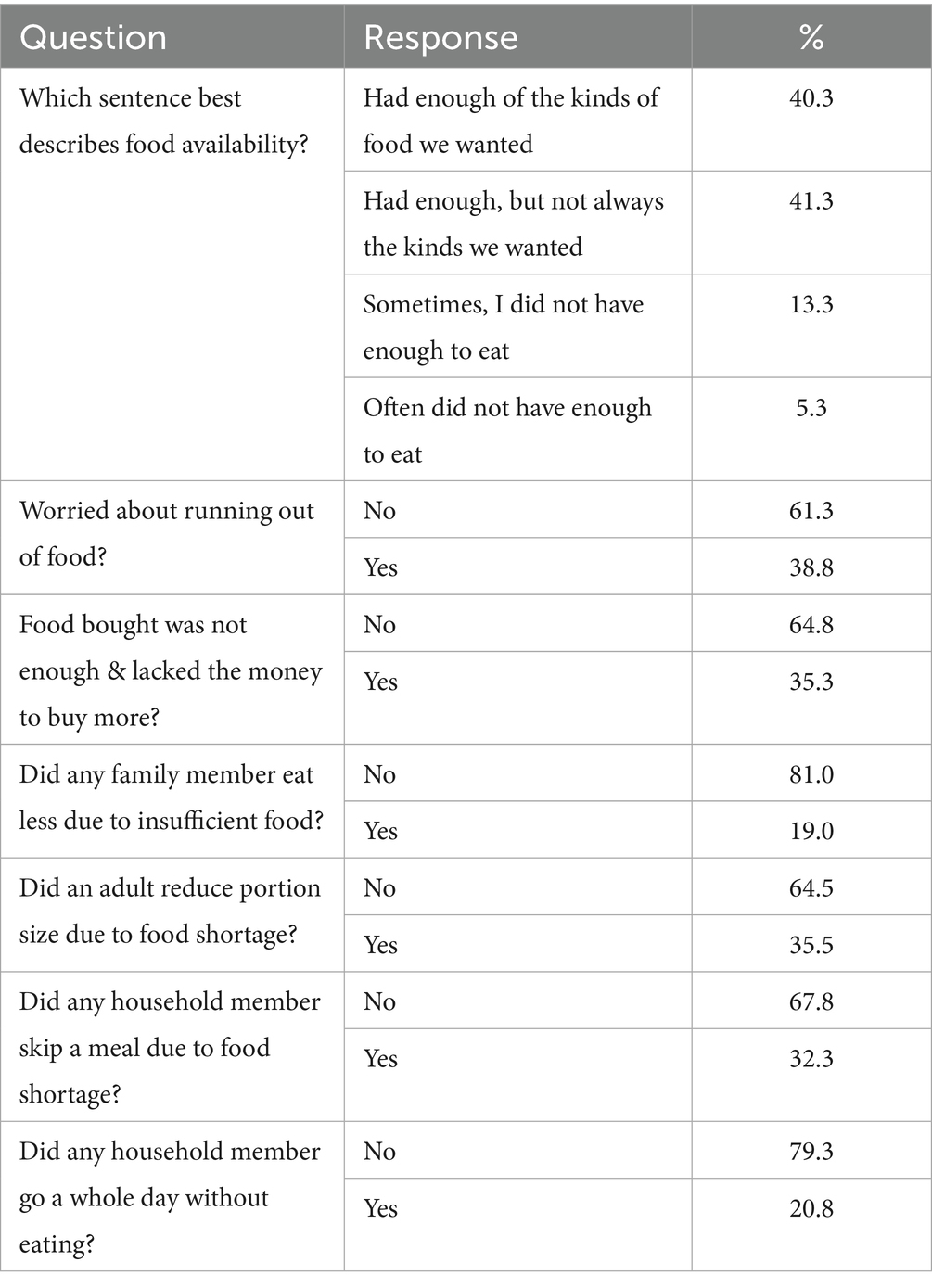 A bigger family size was associated with higher FI (p = 0.003), which aligns with previous studies (35, 36). The increase in household numbers, primarily dependent members such as children or the older adults, can increase demand for food, adding more economic burden on the already limited resources in displacement settings (9). Moreover, 83.3% of households have a monthly income of less than $700$, further exacerbating this issue among big households.