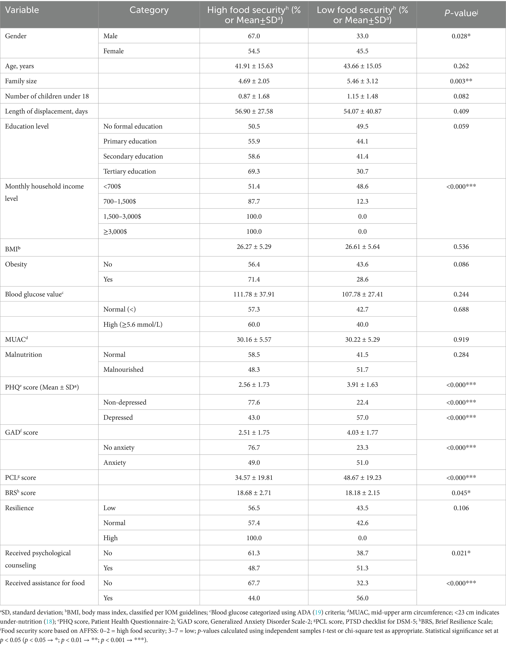 Participants’ characteristics across the two food security categories were compared in Table 3 below. In bivariate analyses, low food security was significantly associated with female gender (p = 0.028), larger family size (5.46 ± 3.12 vs. 4.69 ± 2.05; p = 0.003), lower household income (p < 0.001), and higher PHQ, GAD, and PCL scores (all p < 0.000). The mean BRS score was 18.68 ± 2.71 for the food-insecure group and 18.18 ± 2.15 for the food-secure group (p = 0.045). When categorized, no statistically significant association was observed between resilience category and food security status (p = 0.106). Receiving psychological counseling was more prevalent among low food security participants (51.3% vs. 38.7%, p = 0.021). No associations were found between food security and BMI, MUAC, malnutrition, and blood glucose levels.