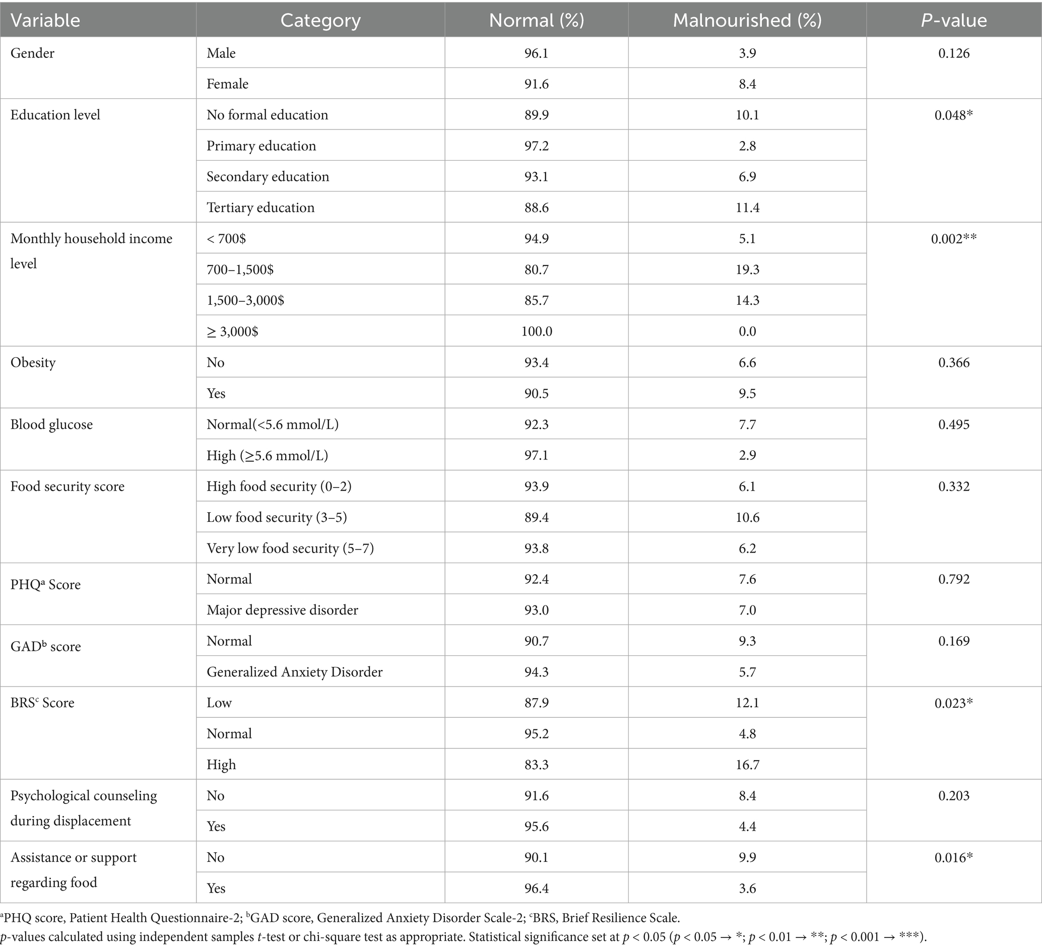 Malnutrition rates were compared across population characteristics in Table 4. Malnutrition was associated with educational level (p = 0.048) and household income (p = 0.002). The highest rates were among tertiary-educated participants (11.4%) and those earning $700–1,500/month (19.3%). Food assistance reduced malnutrition prevalence (3.6% vs. 9.9%, p = 0.016). Moreover, high resilience scores were associated with higher malnutrition (16.7%, p = 0.023), but no association was found with obesity, blood glucose, or psychological counseling.
