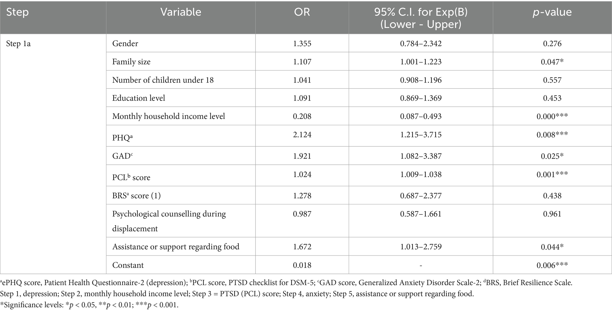 Stepwise logistic regression identified several significant predictors of FI. Variables with p < 0.2 in bivariate analysis were included in the model. Table 5 shows the initial logistic regression model including all significant predictors. Lower monthly household income was strongly associated with higher odds of FI (OR = 0.208, 95% CI: 0.087–0.493, p < 0.001). Higher depression scores (PHQ) were also associated with increased odds of FI (OR = 2.124, 95% CI: 1.215–3.715, p = 0.008), as were higher anxiety scores (GAD) (OR = 1.921, 95% CI: 1.082–3.387, p = 0.025), and higher PTSD scores (PCL) (OR = 1.024, 95% CI: 1.009–1.038, p = 0.001). Additionally, receiving assistance or support related to food was significantly associated with FI (OR = 1.672, 95% CI: 1.013–2.759, p = 0.044), and larger family size showed a modest association (OR = 1.107, 95% CI: 1.001–1.223, p = 0.047).