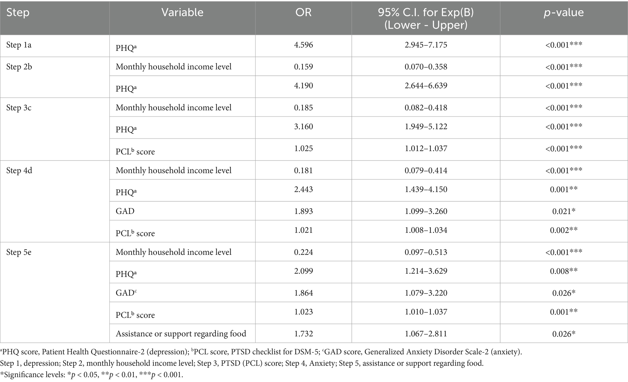 Table 6 presents the stepwise logistic regression model. In step 1, depression (PHQ score) emerged as a notable predictor (OR = 4.596, p < 0.001). Step 2 incorporated monthly household income, which remained significantly associated with FI (OR = 0.159, p < 0.001), while depression maintained its significance (OR = 4.190, p < 0.001). In step 3, PTSD (PCL score) was added and significantly associated with FI (OR = 1.025, p < 0.001), with income (OR = 0.185, p < 0.001) and depression (OR = 3.160, p < 0.001) remaining significant. Step 4 included anxiety (GAD score), which showed a significant association (OR = 1.893, p = 0.021), while income (OR = 0.181, p < 0.001), depression (OR = 2.443, p = 0.001), and PTSD (OR = 1.021, p = 0.002) remained significant. In step 5, receiving food assistance was introduced and associated with higher odds of FI (OR = 1.732, p = 0.026), with income (OR = 0.224, p < 0.001), depression (OR = 2.099, p = 0.008), anxiety (OR = 1.864, p = 0.026), and PTSD (OR = 1.023, p = 0.001) maintaining significance. Overall, lower household income, higher depression, anxiety, PTSD scores, and receipt of food assistance were independently associated with increased odds of food insecurity.