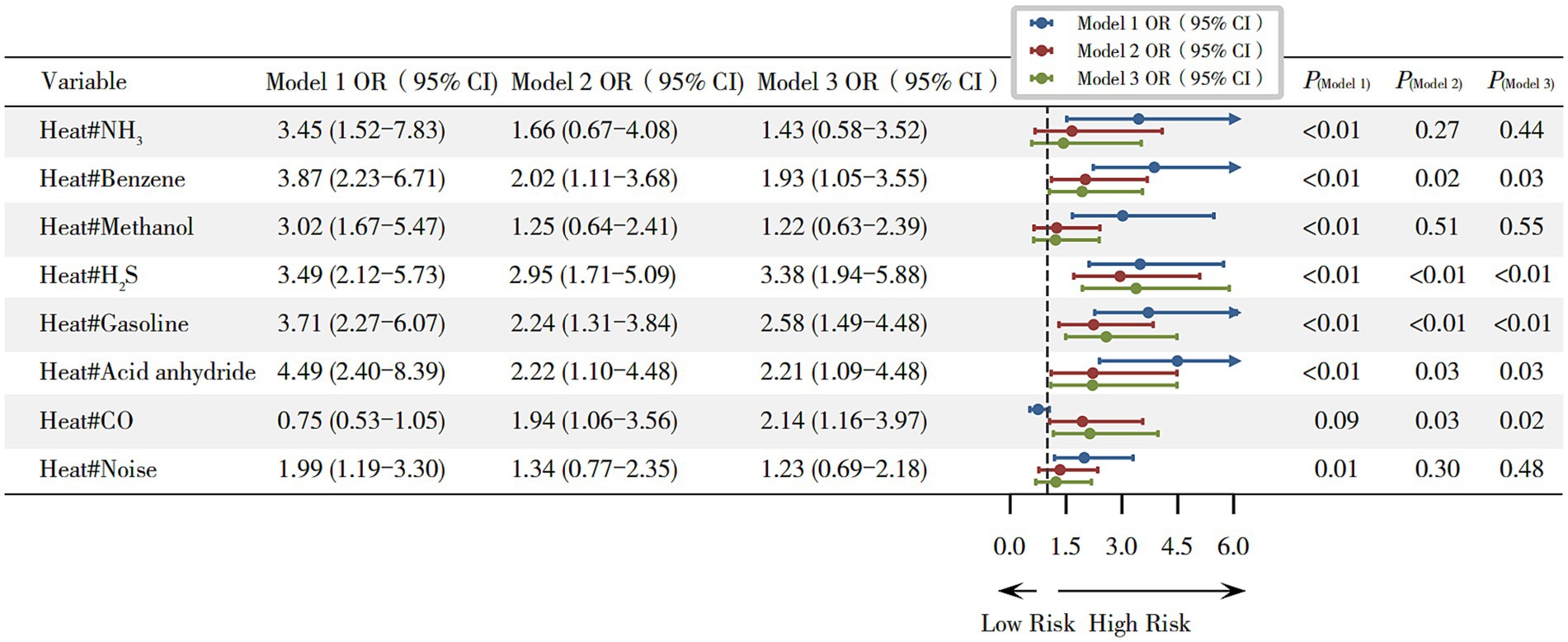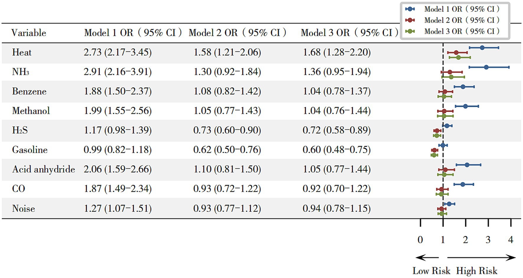 A three-stage stepwise GLM was used to analyze each hazard’s association with hyperuricemia. As shown in Figure 1, in unadjusted analyses, exposure to heat (OR = 2.73, 95% CI: 2.17–3.45), NH3 (OR = 2.91, 95% CI: 2.16–3.91), benzene (OR = 1.88, 95% CI: 1.50–2.37), methanol (OR = 1.99, 95% CI: 1.55–2.56), acid anhydrides (OR = 2.06, 95% CI: 1.59–2.66), CO (OR = 1.87, 95% CI: 1.49–2.34) and noise (OR = 1.27, 95% CI: 1.07–1.51) was associated with a higher risk of hyperuricemia (p < 0.05). After adjustment for age, gender, and BMI, exposure to heat (OR = 1.58, 95% CI: 1.21–2.06) remained statistically significant. In the fully adjusted model, occupational heat exposure remained a significant predictor of hyperuricemia (OR = 1.68, 95% CI: 1.28–2.20), while exposure to gasoline (OR = 0.60, 95% CI: 0.48–0.75) and H2S (OR = 0.72, 95% CI: 0.58–0.89) were associated with lower odds of hyperuricemia.