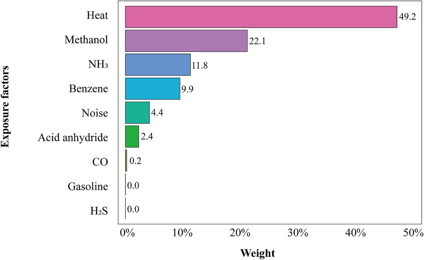 Figure 2 presents the weights of each hazard in the WQS model. Occupational heat exposure had the highest weight (49.2%), indicating it was the dominant contributor to the combined risk. Methanol and NH3 were the next largest contributors (22.1 and 11.8%, respectively).