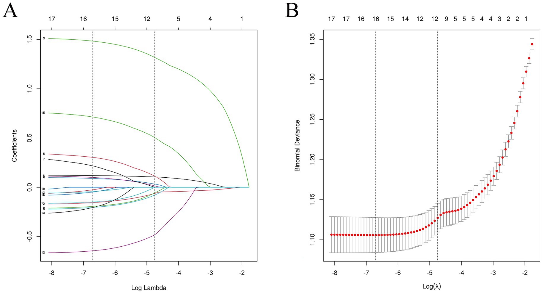 Figure 4. Feature selection of LASSO regression. (A) Shows the coefficient changes of LASSO regression; and (B) shows the fitting effect of LASSO regression.