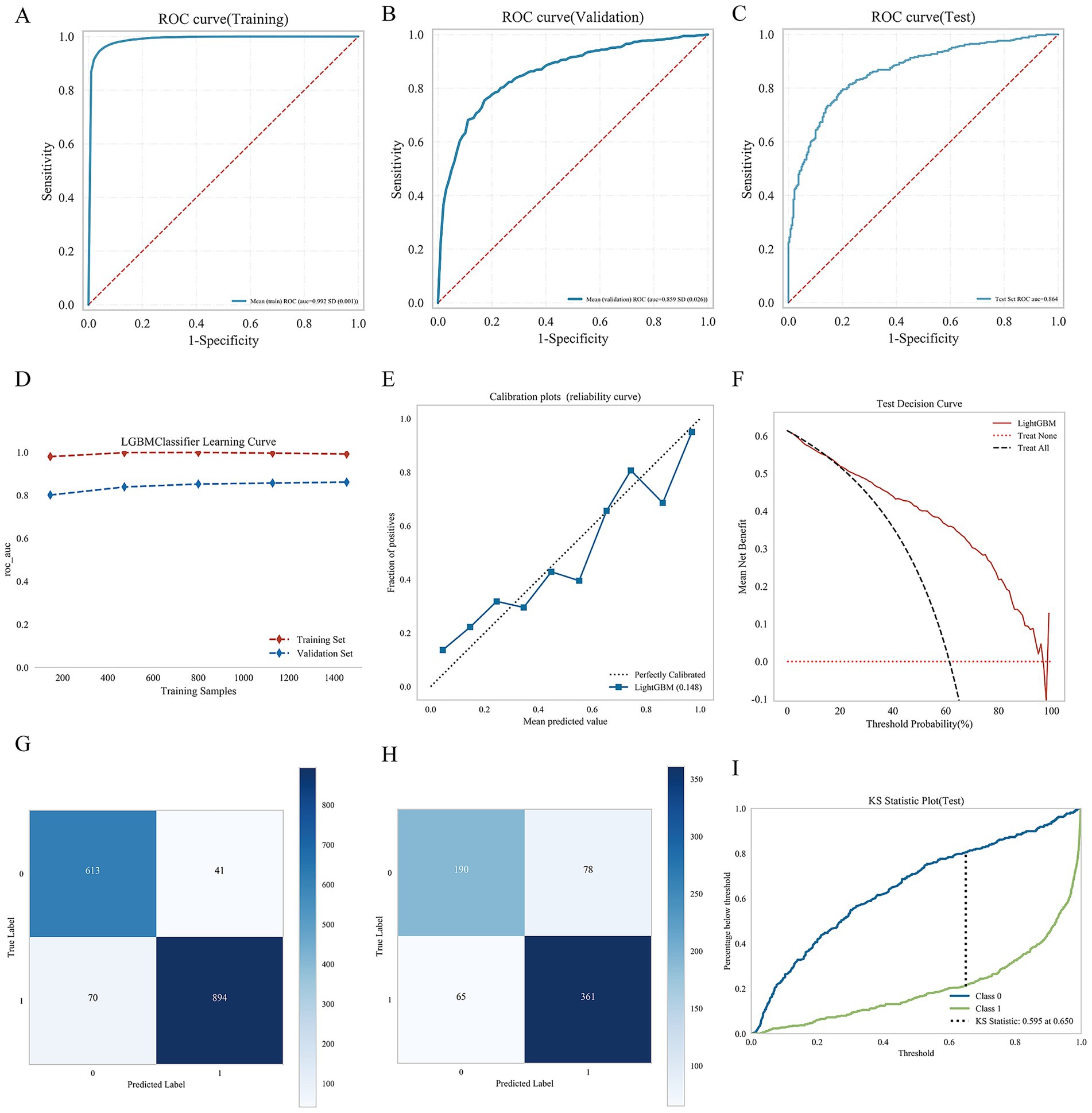 The ROC curve illustrates that LightGBM model achieved AUC value of 0.99 ± 0.01 for the training set, 0.86 ± 0.026 for the validation set, and 0.86 for the test set. The AUC difference between the validation and test sets was less than 10%, indicating good model generalization. The calibration curve showed good agreement between predicted probabilities and observed outcomes, with minor deviations at lower and midrange probability levels. Decision curve analysis (DCA) revealed that, across a wide range of threshold probabilities (0.1–0.7), the LightGBM model yielded a greater net benefit than both the “treat-all” and “treat-none” strategies. The confusion matrix indicated minimal risk of overfitting in the training set but a slightly elevated false-positive rate in the validation set. In addition, the KS statistics confirmed excellent discriminatory capacity and generalizability (KS = 0.60), with the optimal classification performance observed at a threshold of 0.65. Detailed results are shown in Figure 5.