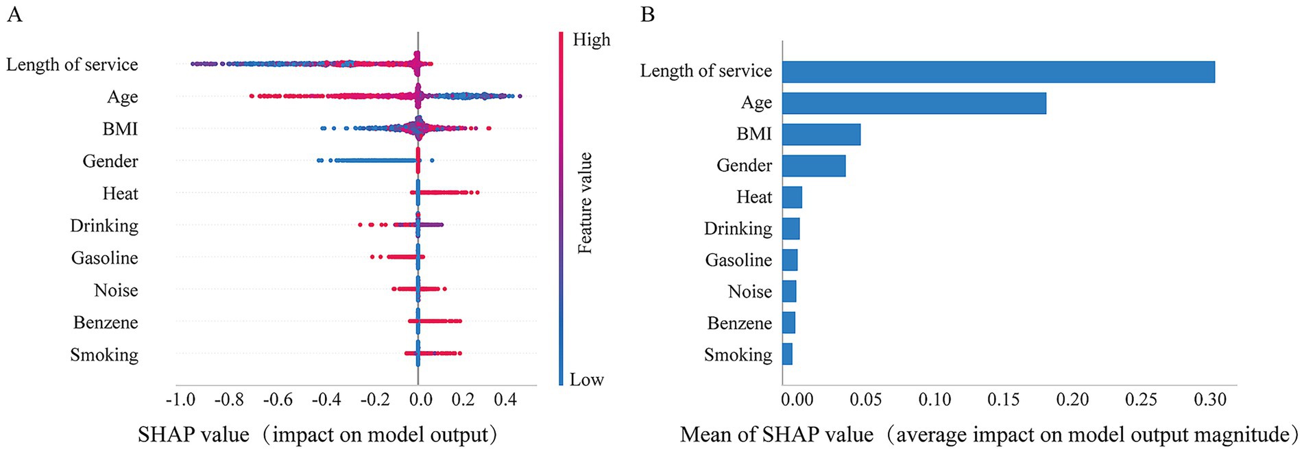 The results showed that the SHAP values for BMI and heat were positively associated with hyperuricemia, suggesting an increased risk of hyperuricemia with higher levels of these variables, whereas length of service and age showed a negative association. The bar chart represents the relative importance of each feature in the LightGBM model, with the top five most important features were length of service, age, BMI, gender, and heat exposure. Heat exposure was strongly occupational hazards associated with an increased risk of hyperuricemia. The detailed SHAP analysis results are shown in Figure 6.