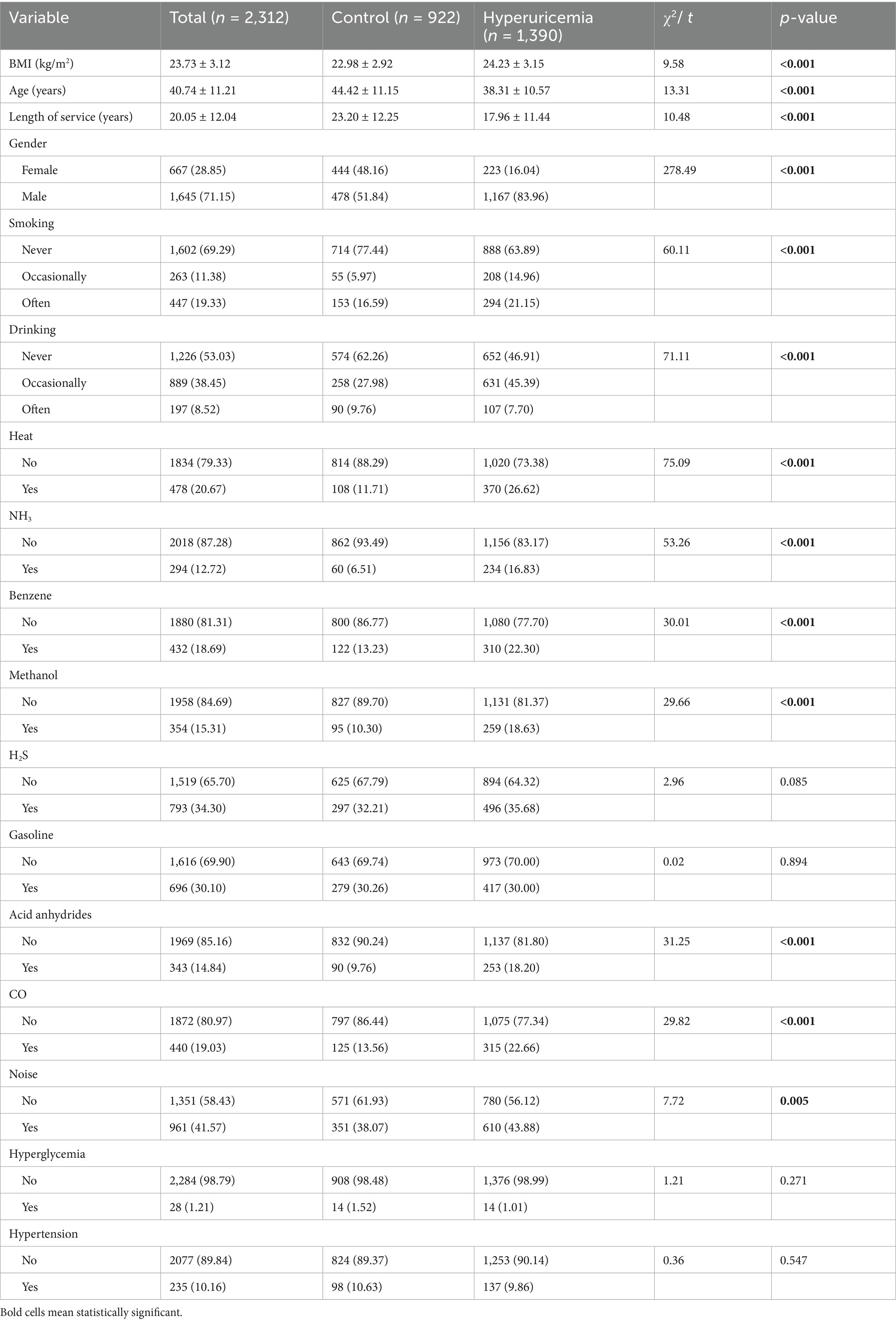 In this study, among the 2,312 workers, 1,390 (60.1%) had hyperuricemia. Compared to those without hyperuricemia, affected workers had significantly higher BMI (24.23 vs. 22.98 kg/m2) and a higher proportion of males (83.96% vs. 51.84%). As shown in Table 1, workers with hyperuricemia were more likely exposed to occupational hazards, including heat, NH3, benzene, methanol, acid anhydrides, CO, and noise (all p < 0.05).