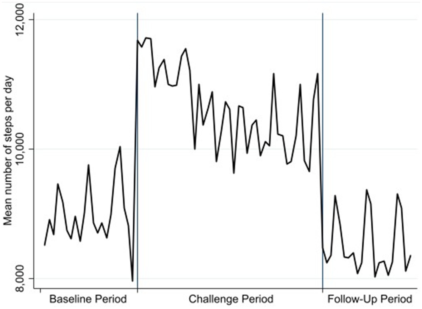 Participants showed strong initial engagement, likely driven by novelty, followed by a gradual decline, suggesting potential fatigue or being incompatible with daily duties over longer terms. This pattern underscores the importance of monitoring and addressing factors that may contribute to decreasing activity over time. After the challenge, step counts dropped, indicating that while short-term interventions effectively boost activity, maintaining long-term habits may require additional strategies. Step counts were even lower than before the challenge, though not statistically significant, possibly due to recovery after an intense final push or a return to typical activity levels if participants had increased their steps during the baseline period in preparation for the challenge.