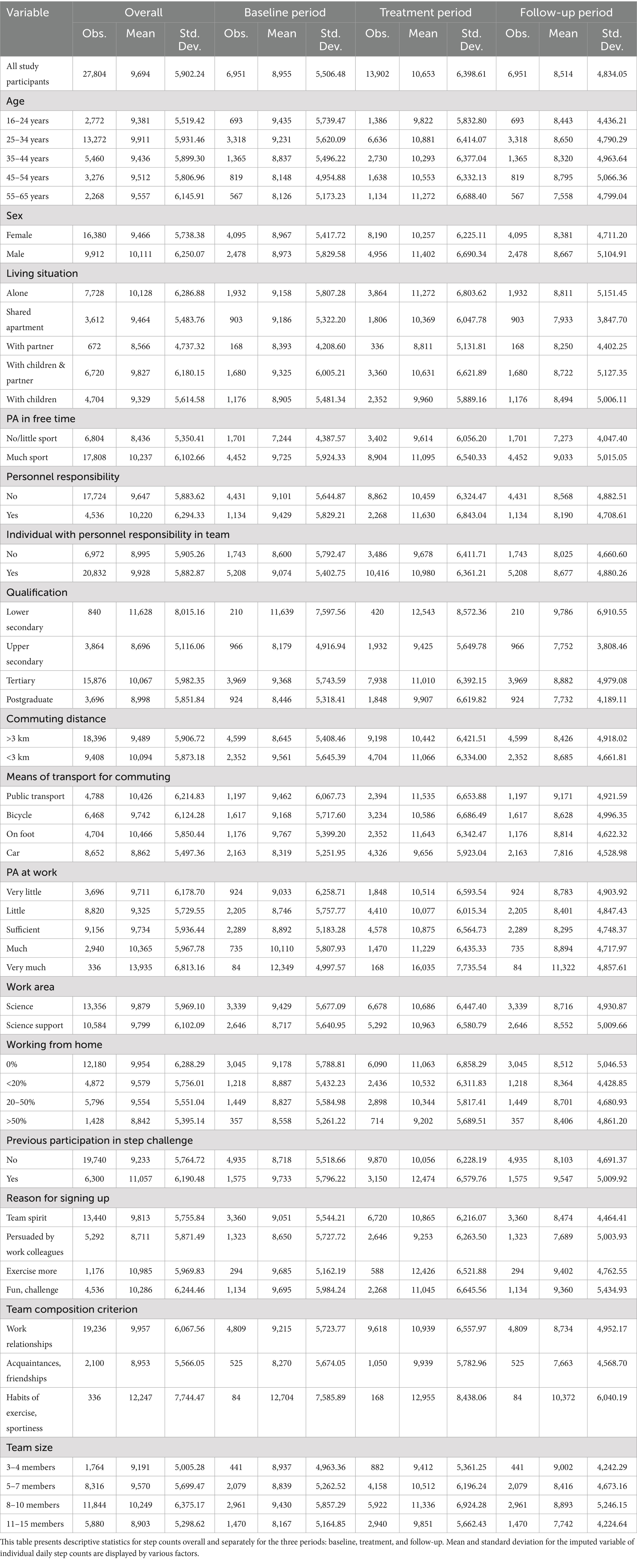 We chose a one-group pre-post design. Participants’ daily steps served as primary outcome. Participants with no valid step data were excluded. To ensure data quality, extreme values (<1,000 or >35,000 steps/day) were treated as missing values (26, 45, 56), based on the distribution of our dataset, where the 5th percentile was 950 steps and the 99th percentile was 34,079 steps. Values outside this range were rare and potentially affected by device errors or manipulation. An individual-centered imputation method for missing step counts by using the average of individual’s weekday or weekend data (56) was applied separately to each phase (baseline, intervention, follow-up). For individuals who had no data available from any weekday or weekend within a specific period, we substituted the missing steps with the overall weekday or weekend average. With these procedures we obtained a balanced dataset of 27,804 observations from 331 participants in total. For variables related to participants’ self-reported characteristics, a worst-case scenario approach was applied (14). Every missing data point was treated as such and not imputed. Responses marked as “other” were treated as missing.