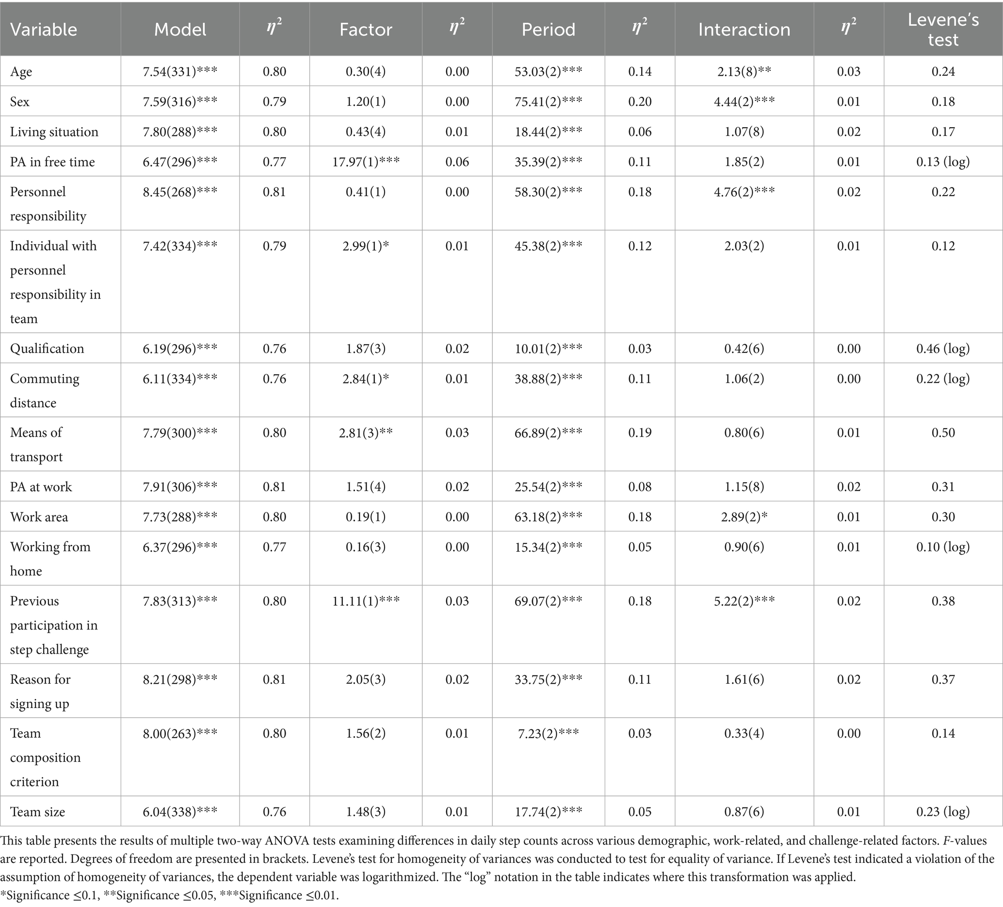 Besides descriptive statistics (mean ± standard deviations), one-way mixed analysis of variance (ANOVA) with repeated measures was conducted to assess changes in step counts across study periods (baseline, intervention, follow-up). Post hoc pairwise comparisons with Bonferroni correction were applied. Additionally, two-way ANOVA with repeated measures was used to examine differences in step counts and intervention effectiveness based on personal and work-related factors. Participants’ mean daily step counts served as dependent variable. If Levene’s test indicated a violation of the assumption of homogeneity of variances, the dependent variable was logarithmized. Pearson pairwise correlation analysis was performed to explore relationships between participants’ characteristics. Analysis was conducted using Stata Version 17.0.