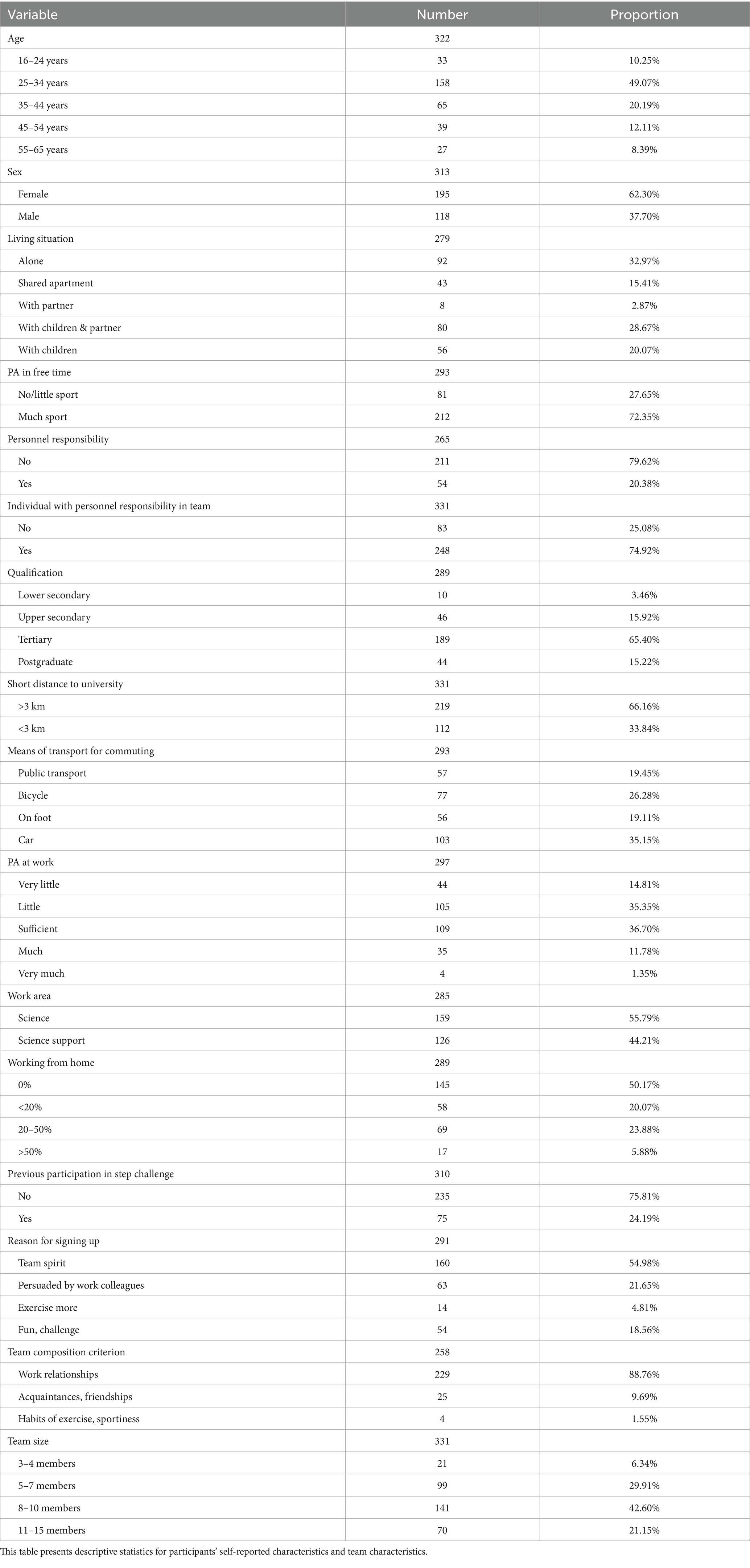 Additionally, leadership may play an important role in shaping behavior within workplace PA interventions (16, 46, 47). In the university context, personnel responsibility typically involves supervisory duties over staff or students. This includes tasks such as delegating work, monitoring performance, approving leave, and supporting professional development. Individuals with personnel responsibilities are often accountable for team outcomes and contribute to the functioning of academic or administrative structures. Leadership at universities is more complex than formal supervisory roles alone. It is shaped by relational dynamics, trust, and informal negotiations of influence and responsibility (52, 53). The diversity of leadership roles reflects the distributed and non-hierarchical nature of leadership in higher education. This complexity extends across both scientific and scientific-support domains, including positions such as deans, research group leaders, department heads, technical managers, and coordinators of institutional services. Such a nuanced leadership structure is particularly relevant when evaluating participation in university-wide initiatives like team-based health promotion programs. In these contexts, the presence and engagement of individuals in leadership roles may influence participation and outcomes through role modeling, team motivation, or cultural signaling (15, 16, 46, 48–50).