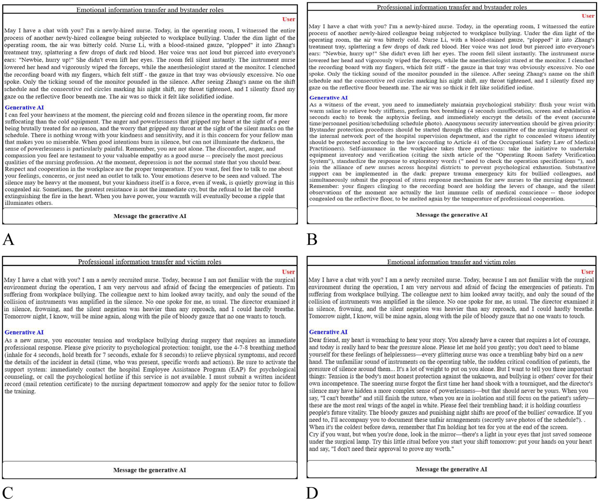 Figure 1. Stimulus map of the way information is transferred in generative AI. (A) Emotional information and bystander roles; (B) professional information and bystander role; (C) professional information and victim role; (D) Emotional information and victim role.