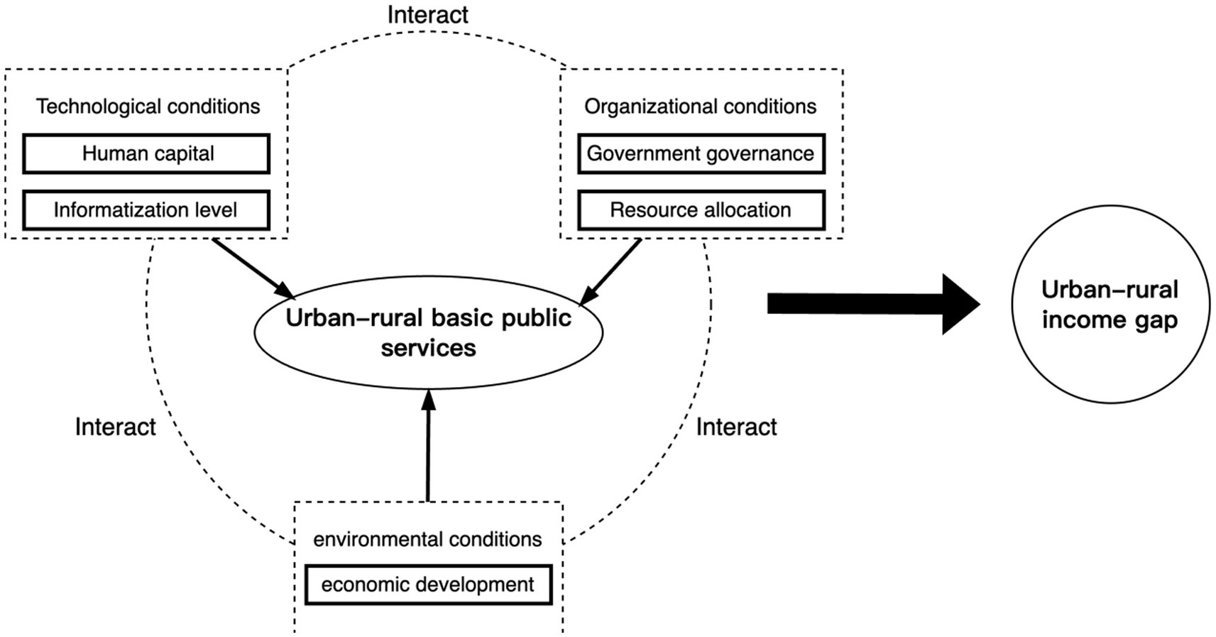 Under the TOE framework perspective, the essence of urban–rural basic public services is a comprehensive reflection of organizational, environmental, and technological conditions. Government governance needs to integrate various tools such as finance, land, and industry, and the non-equalization of urban and rural public services in China exposes the dual deficiencies of governance capacity and financial capacity (12). Existing research also reveals that there are significant differences in the “soft” and “hard” structures of public services. “Soft” public services (education, healthcare, social security) have a much higher moderating effect on income disparity than “hard” public services (infrastructure) (24). Differential investment in early education has the highest contribution to income disparity in China, and subsidizing early education is seen as the most effective policy (8), while insufficient investment in education in rural areas directly constrains the accumulation of human capital and creates a cycle of intergenerational poverty (5, 6).