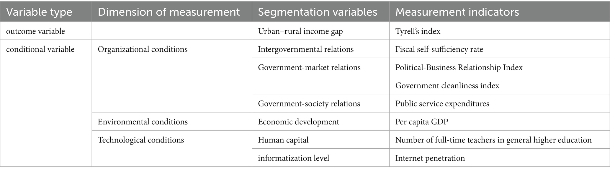 The TOE framework of organizational conditions focuses on the role of intra-organizational attributes on technology application and decision-making, covering core elements such as resource availability, organizational rules, and policy support (44, 45). According to public choice theory, this study refines organizational conditions into three types of indicators: intergovernmental relations, government-market relations, and government-society relations. Intergovernmental relations are measured by the financial self-sufficiency rate, which not only reflects the financial autonomy of the local government but also fits the assumption of “bureaucratic budget maximization” in public choice theory and reveals that resource allocation barriers are formed by financial competition between governments. The government-market relationship is measured by the government-business relationship index and the government cleanliness index, which correspond to the public choice theory’s criticism of rent-seeking behavior and quantitatively assess the risk of resource mismatch due to collusion or corruption among interest groups; the government-society relationship is measured by the public service expenditure index, which echoes the “middle-voter theorem,” reflecting the problem of inadequate rural service provision and inefficient resource allocation due to voter preference bias in government spending decisions (45). Resource support at the organizational level is the foundation of technology application and social governance (53), and the improvement of governmental governance capacity and rational allocation of resources can alleviate income inequality by narrowing the urban–rural public service gap.