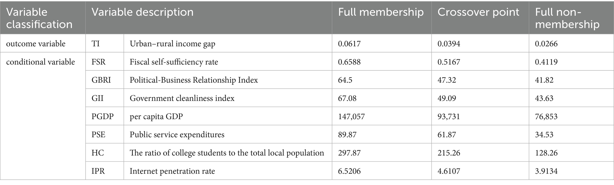 In this study, the observed variables are calibrated using the direct method, which involves changing them into fuzzy-sets. Based on the treatment in the published literature (55), “three anchor points” for the four condition variables and one outcome variable (Thiel index) are selected: “full membership,” “crossover point,” and “full non-membership.” Specifically, the anchor points for the sample data are the upper quartile (75%), median, and lower quartile (25%). The calibration of the non-high urban–rural income gap is achieved by excluding the high urban–rural income difference. Table 2 shows the specific calibration findings for each study variable.