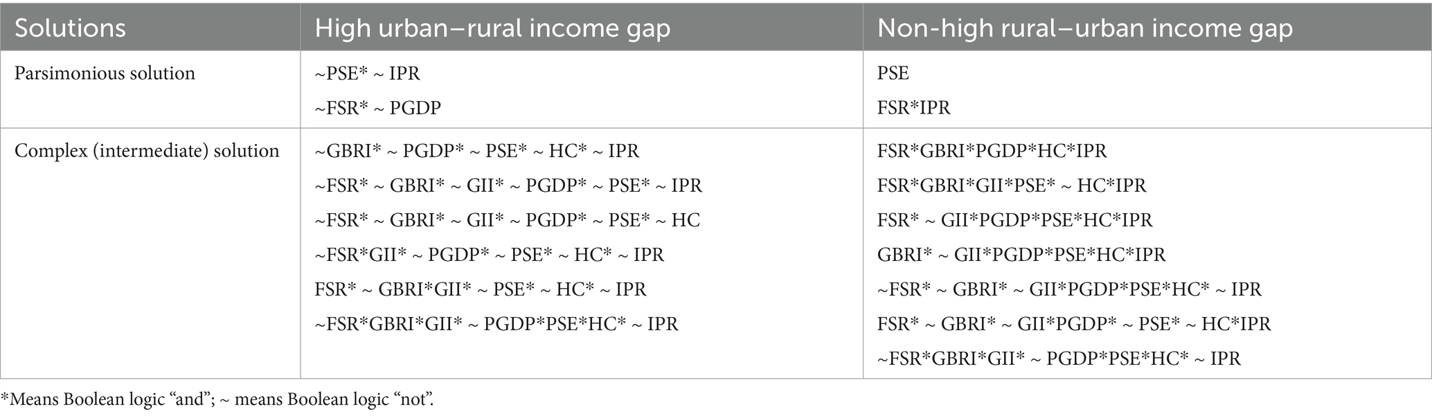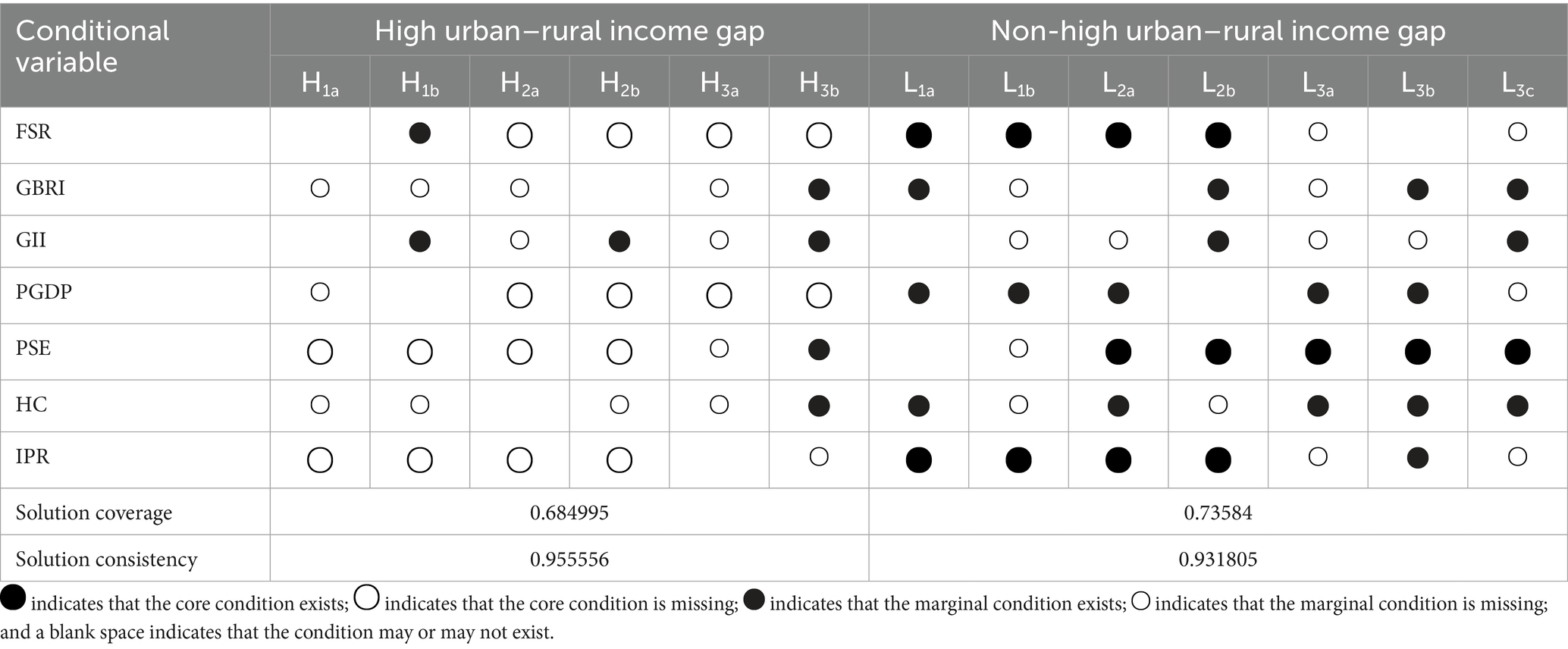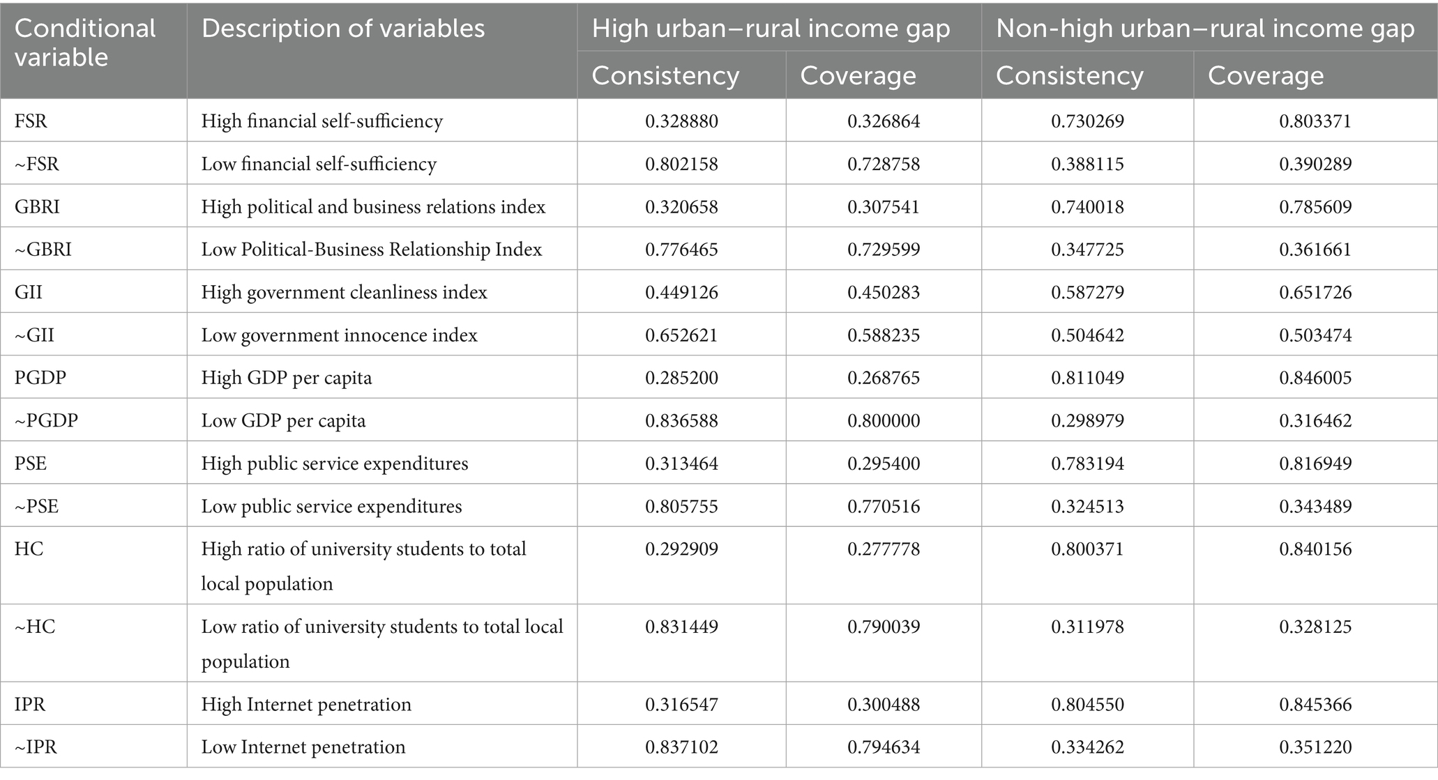 This study empirically examines the possible adequacy or necessity of the relationship between conditional variables and outcome variables in terms of the dimensions of consistency and coverage. Using the fsQCA 4.1 analysis tool, reference was made to established research (56), and in order to ensure the reliability of the study’s conclusions, a systematic analysis was also carried out to analyze the situations where the condition variable had a missing status (marked with a “~“). The empirical results show (Table 3 for details) that the consistency of individual conditional necessities is below the threshold of 0.9 for determining the necessity condition, a finding that suggests that, in the case of urban–rural basic public services, none of its dimensional indicators meets the criteria of the necessary preconditions that drive the urban–rural income gap.