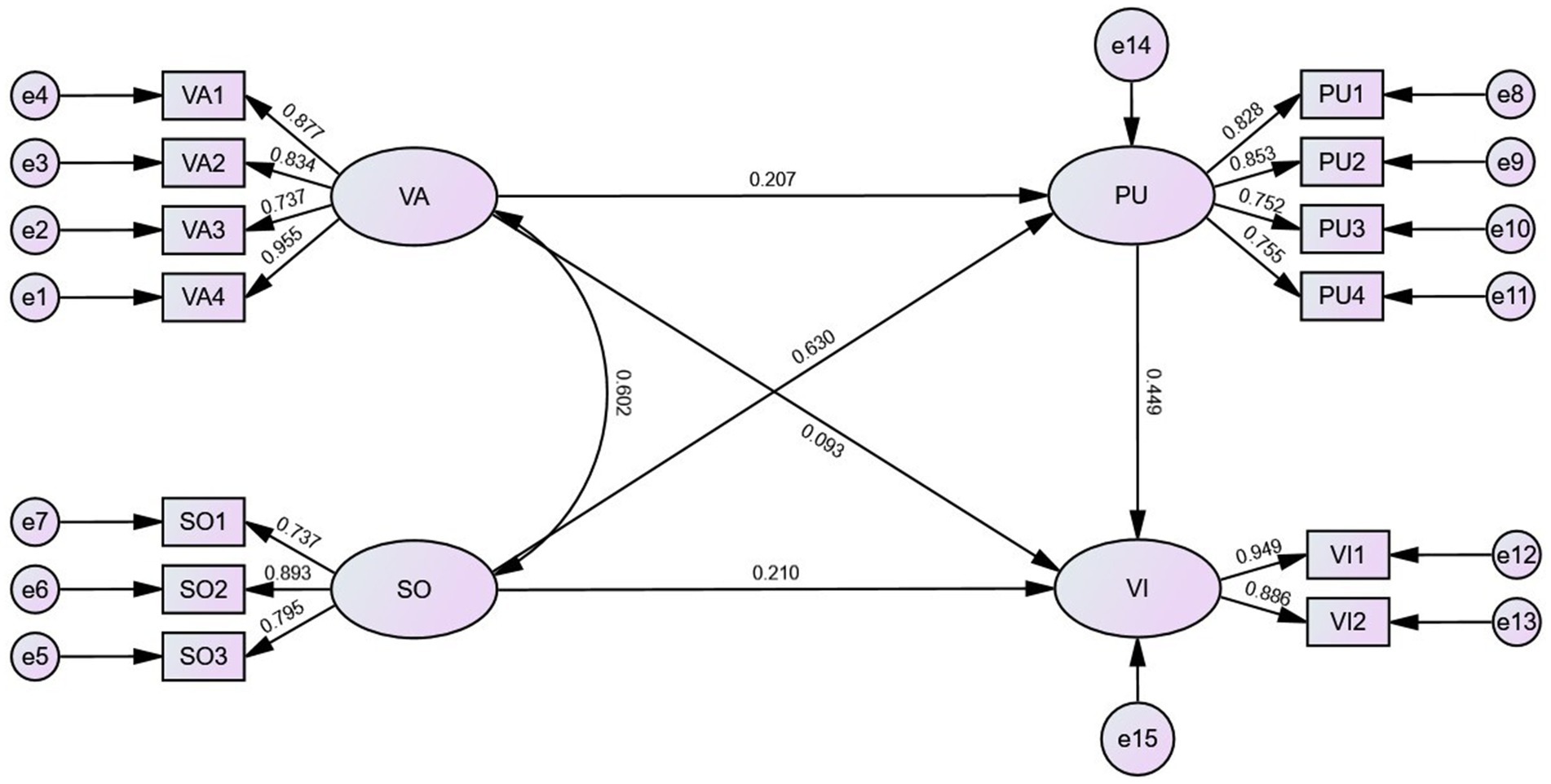 Figure 1. Structural equation modeling of accessibility of vaccination service, social norms, perceived usefulness and vaccination intention (sample size = 481). For path arrows, the digits were standardized regression coefficients. The circles indicated latent variables and boxes represented observed indexes. VA, accessibility of vaccination services; SO, social norms; PU, perceived usefulness; VI, Vaccination intention.