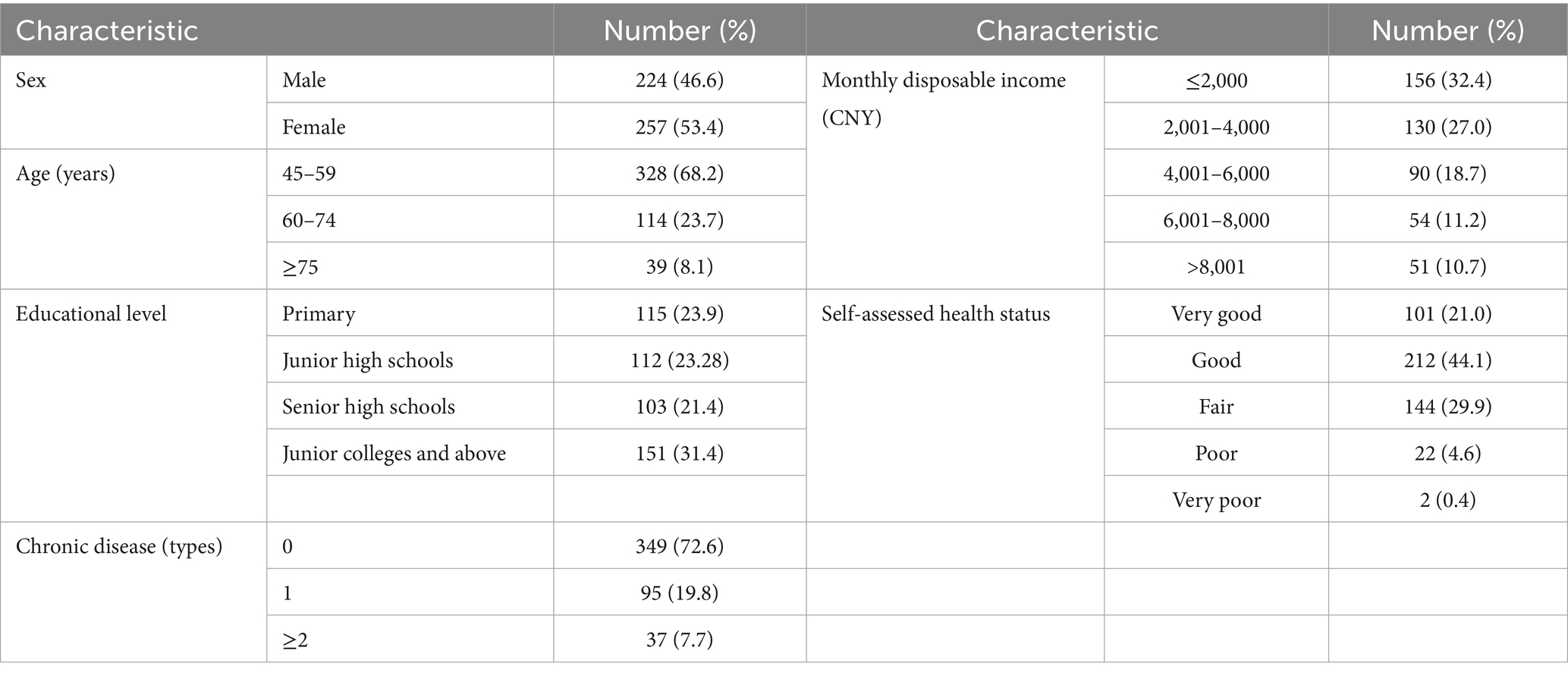 Taking Chongqing as an example, we implemented a mixed sampling approach to balance methodological rigor with practical feasibility. At the regional level, we employed stratified sampling based on the per capita GDP levels reported by the local statistical bureau in 2022 (39) and the World Bank’s per capita GDP data for 2023 (40). The study first stratified districts into two groups of high-income and upper-middle-income. Within each selected group, two districts/counties were randomly selected. Subsequently, one to two streets/townships were randomly selected from each chosen district/county, and one to three communities/villages were randomly selected from each street/township. In total, the survey was conducted across seven streets/townships. At the individual level, participants aged 45 and above were recruited through convenience sampling within these selected communities/villages. Ensuring the suggestion that the ratio of the number of sample sizes to the number of latent variable measures is greater than 10:1 (41). All participants were at least 45 years old, lived in Chongqing for more than half a year, and were voluntary and conscious to participate in the survey. A final sample size of 481 was obtained, with an effective rate of 93.94%. The basic demographic characteristics of the 481 participants are shown in Table 1.