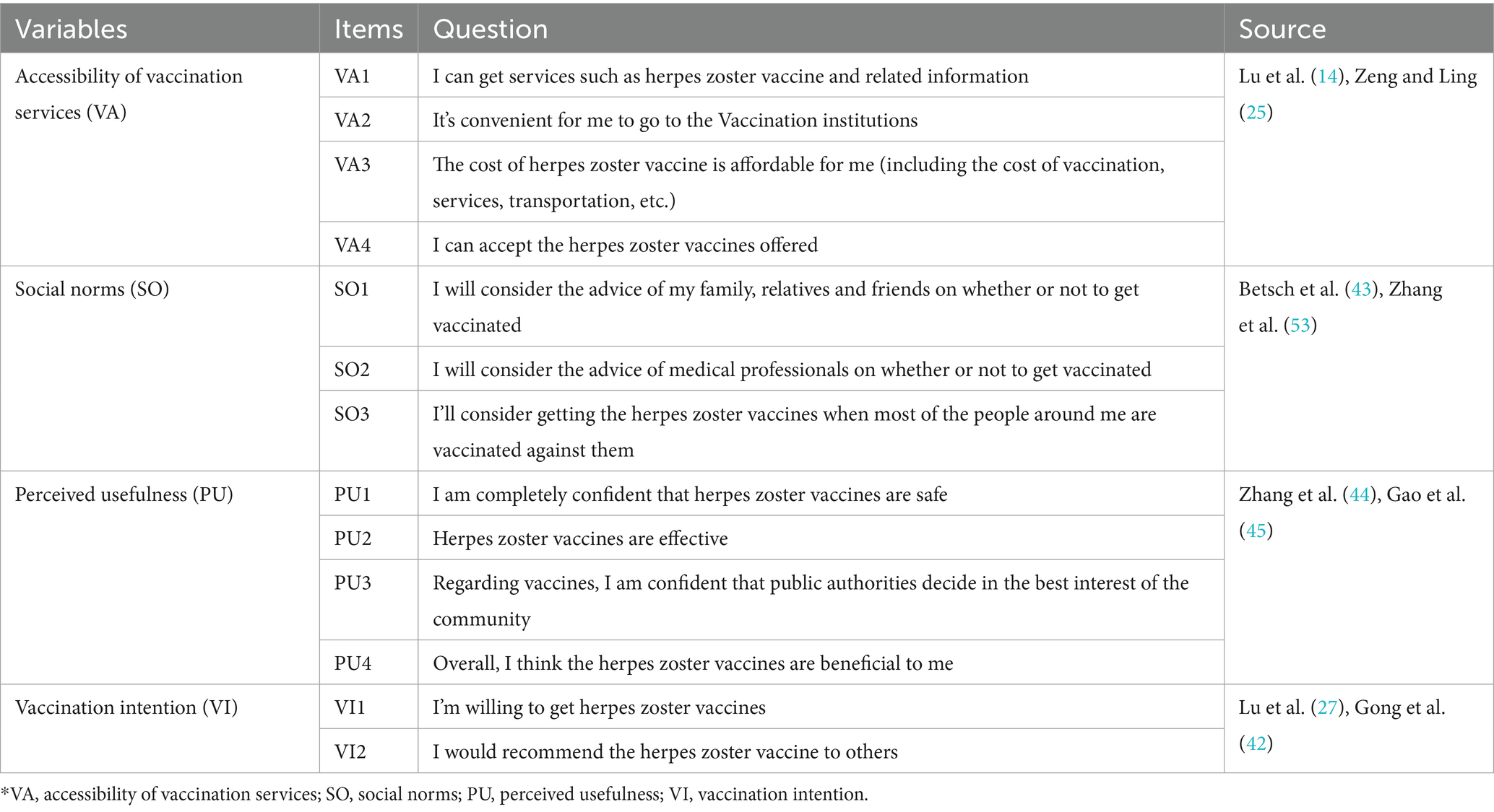 Following the questionnaire’s initial creation, the group engaged in multiple discussion and revision on it within 5 weeks. Additionally, we gathered pertinent feedback from two medical statistics specialists, four health management specialists, and three public health specialists. Incorporating their recommendations, the economic affordability component within the accessibility dimension was explicitly refined to encompass costs such as transportation fees and service charges, while also integrating information related to the availability of vaccination services. After that, 32 middle-aged and older adults over 45 participated in a pre-survey. The questionnaire’s wording and structure were once more adjusted according to the survey’s actual circumstances. The results indicated that the reliability and validity of the questionnaire met the required standards, and the division of dimensions was reasonable. Further refinements were made based on pretest findings, including repositioning items of intention to the final section of the questionnaire, adding explanatory notes on the colloquial term for herpes zoster, and removing redundant phrasing enhance clarity and conciseness. The question items of each dimension of the scale are shown in Table 2.