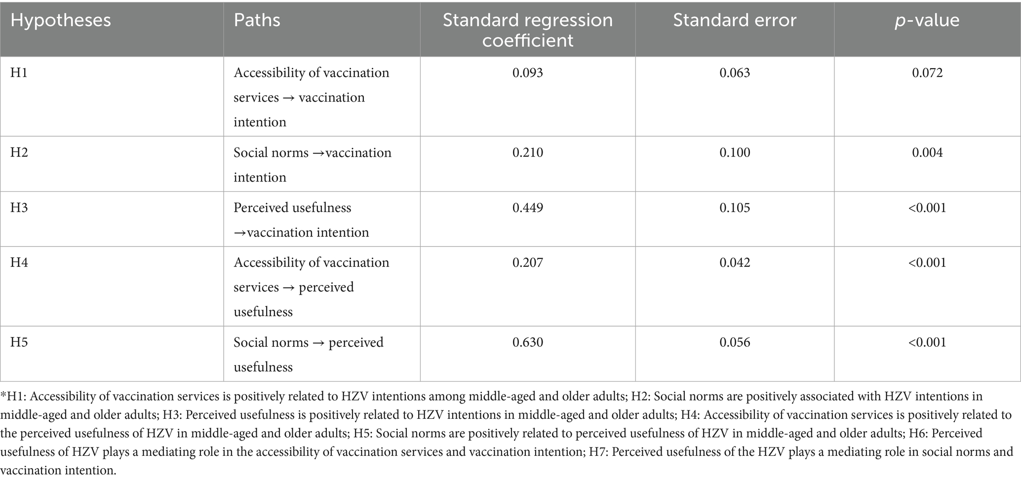 The hypotheses were tested using the Bootstrap method. The results showed that social norms (β = 0.210, p = 0.004) and perceived usefulness (β = 0.449, p < 0.001) were positively associated with the intention of middle-aged and older adults to be vaccinated against herpes zoster, while the accessibility of vaccination services had no significant association on the willingness to be vaccinated, and the hypotheses H2 and H3 were proven. The accessibility of vaccination services (β = 0.207, p < 0.001) and social norms (β = 0.630, p < 0.001) showed positive associations with perceived usefulness (Table 3; Figure 1), respectively, and the hypotheses H4 and H5 were proven.