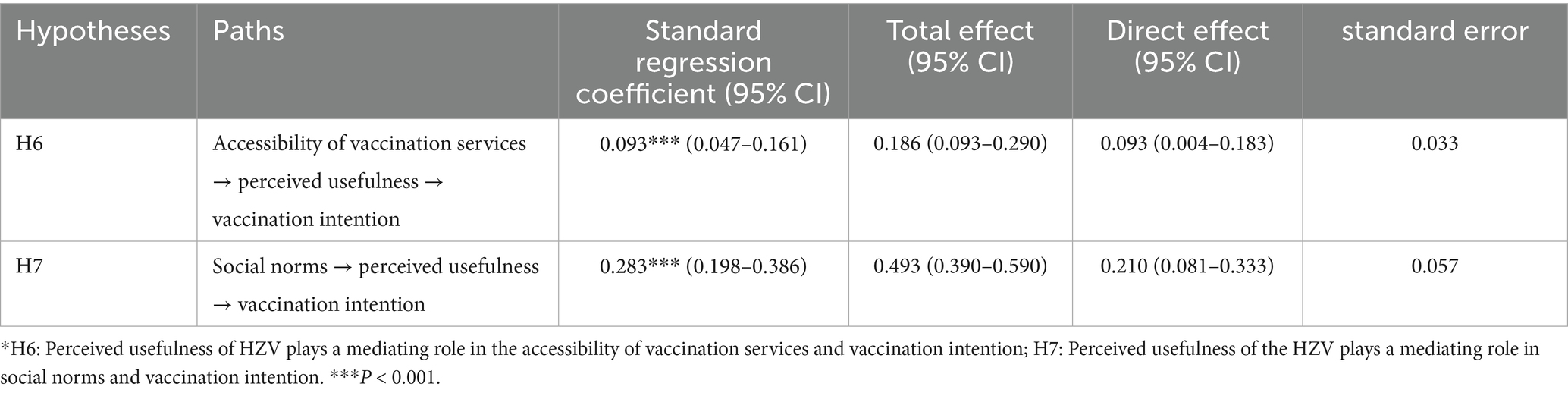 H6: Perceived usefulness of HZV plays a mediating role in the accessibility of vaccination services and vaccination intention.