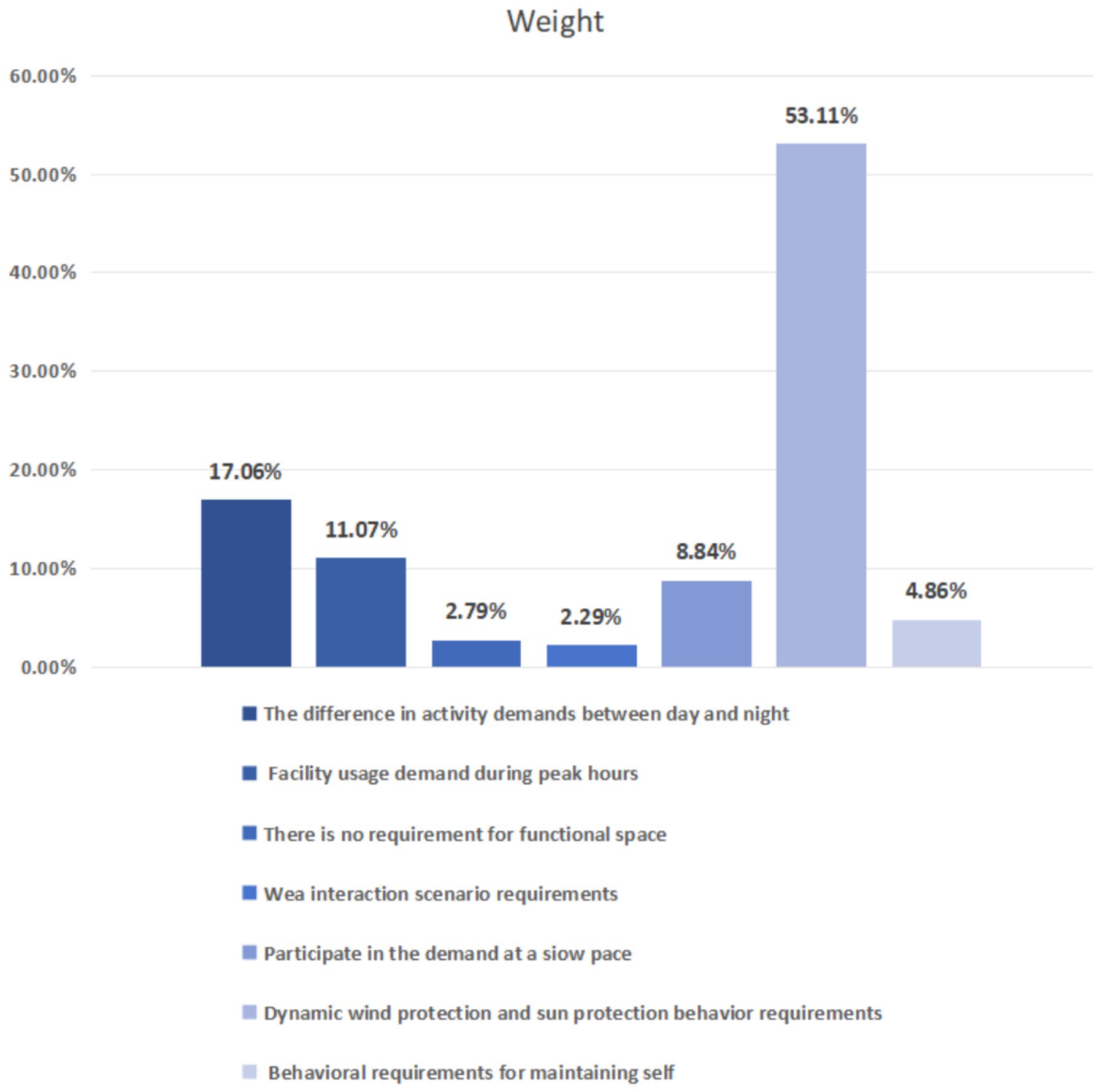By analyzing the semantic judgment data of five experts, the results show that “dynamic wind shelter and sunshade behavior requirements,” “differences in circadian activity requirements” and “facility usage requirements during peak hours” have a high consensus of importance among the expert group, reflecting the high dependence of the older adults population on climate adaptability, rhythm responsiveness and spatial organization efficiency in their daily activities.