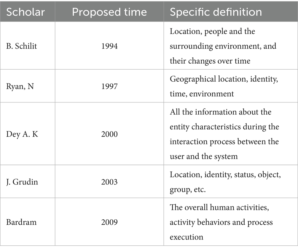 Context represents the combination of subjective consciousness and objective existence within a certain period of time, including characters, time, surrounding environment, behavioral tasks, geographical location, etc. In current research, the most widely applied definition is that proposed by Dey et al. (34): a situation is any information about the characteristics of an entity, which is a person, place, or object related to the interaction process between the user and the application. Situation theory research began with Schicit et al.’s (35) proposal of situation awareness in 1994. That is, a system can actively perceive changes in a user’s situation through context-aware computing capabilities, providing timely and accurate information and services according to their current situational needs. With further research across various fields, the study of situational theory has gradually become systematic. Table 1 is a summary of definitions of context in relevant studies, beginning with the dimension of time.