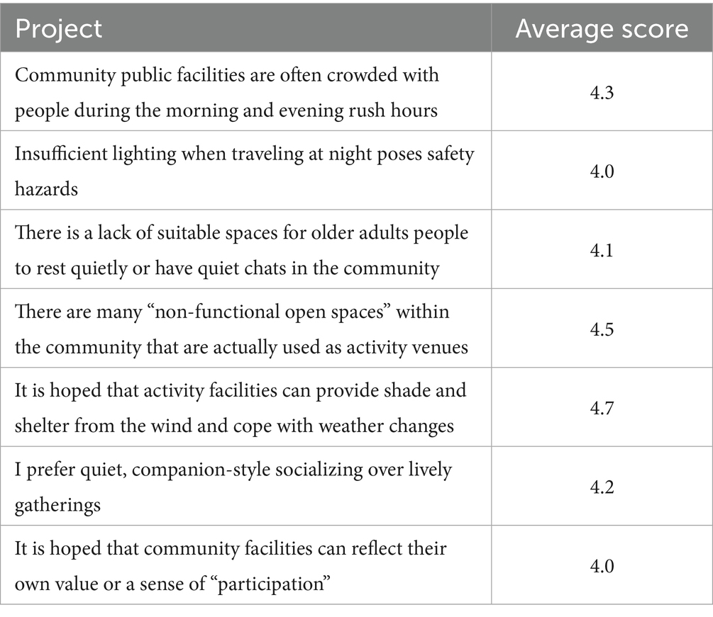 Table 2 shows a summary of the average scores of the Likert-scale items (with a full score of 5 points). The score data show that, in light of climate change, older adults people have the most urgent need for facilities such as shading and wind protection. Residents also acknowledge the current passive use of non-functional spaces. However, such use implies the potential for more reasonable planning and design for these spaces. In addition, a lack of social spaces and insufficient security guarantees at night are common concerns. Overall, older adults people prefer slow-paced, low-intensity, and light-flow spatial experiences. They tend to use facilities that reflect their sense of participation and value.