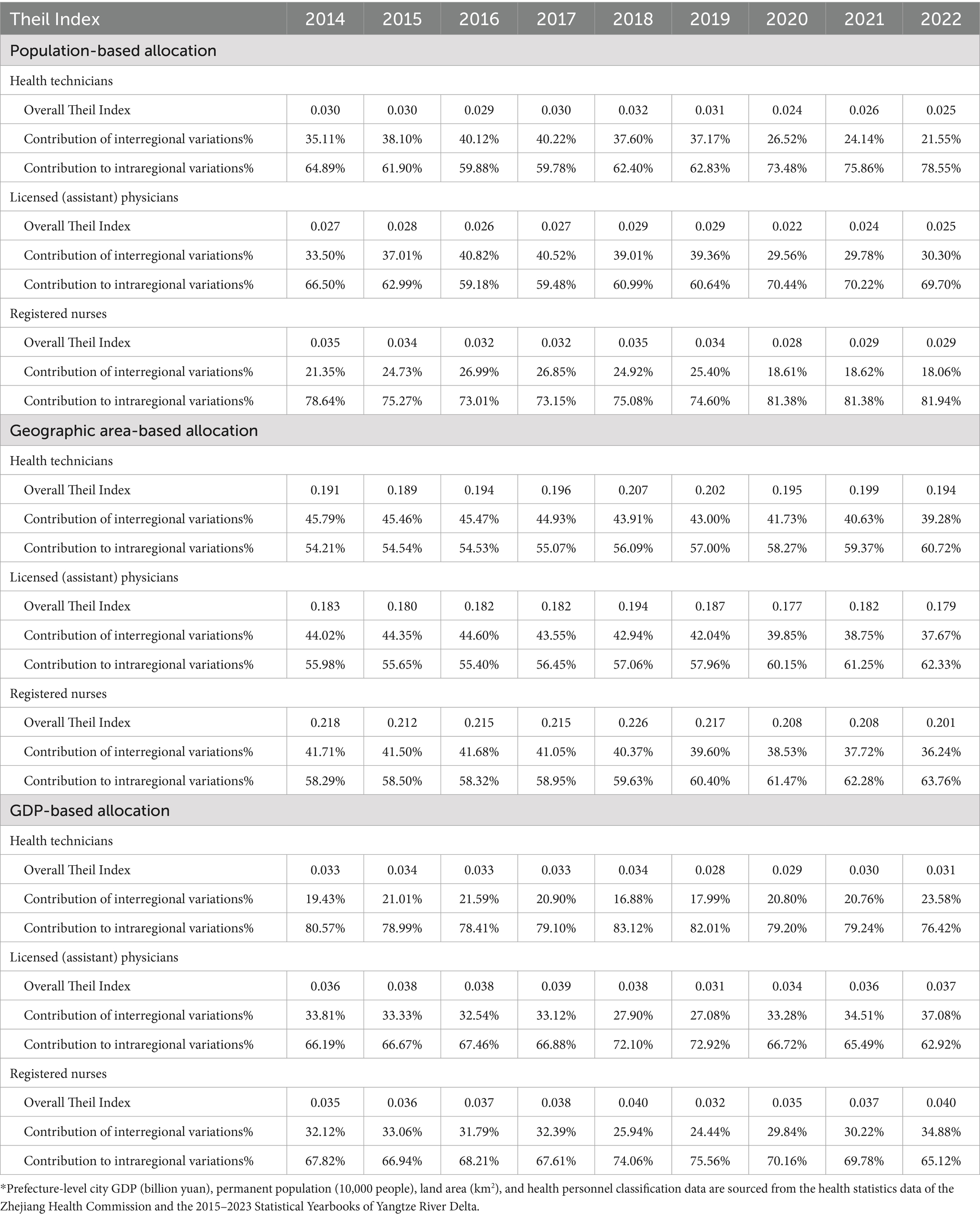 Meanwhile, geographic inequity has been found in previous studies to remain an unavoidable problem in the allocation of health human resources (24). This problem exists not only in China but also in other developing countries. For example, in India (25) and Mexico (26), inequality also exists in the geographical distribution of health workers. The World Health Organization’s report also notes that the healthcare industry is facing severe human resource challenges due to the impact of the COVID-19 pandemic. According to a 2023 report, at least 55 countries/regions are currently experiencing severe shortages of healthcare personnel. This issue is particularly severe in Africa, where 37 countries are struggling to address this shortage, which threatens their ability to achieve universal health coverage by 2030 (27, 28). This article comprehensively assesses the equity of health human resource allocation in the Yangtze River Delta region from different perspectives by integrating three methods to provide data support and theoretical basis for optimizing health resource allocation. Research findings indicate that when categorised by geographical region, the Gini coefficient and Theil index results for healthcare human resource allocation exceed those derived from population and GDP-based divisions. Moreover, intra-regional variation proves predominant, a conclusion robustly supported by substantial statistical evidence. Additionally, this result is consistent with the research findings of Ma (29), Shao (27), and Zhou (30). This provides greater confirmation of the effectiveness of the current distribution policy, which is primarily based on demographic factors, in achieving fundamental fairness. However, it also highlights that relying alone on population indicators may prove insufficient to overcome inequalities stemming from geographical and economic factors.