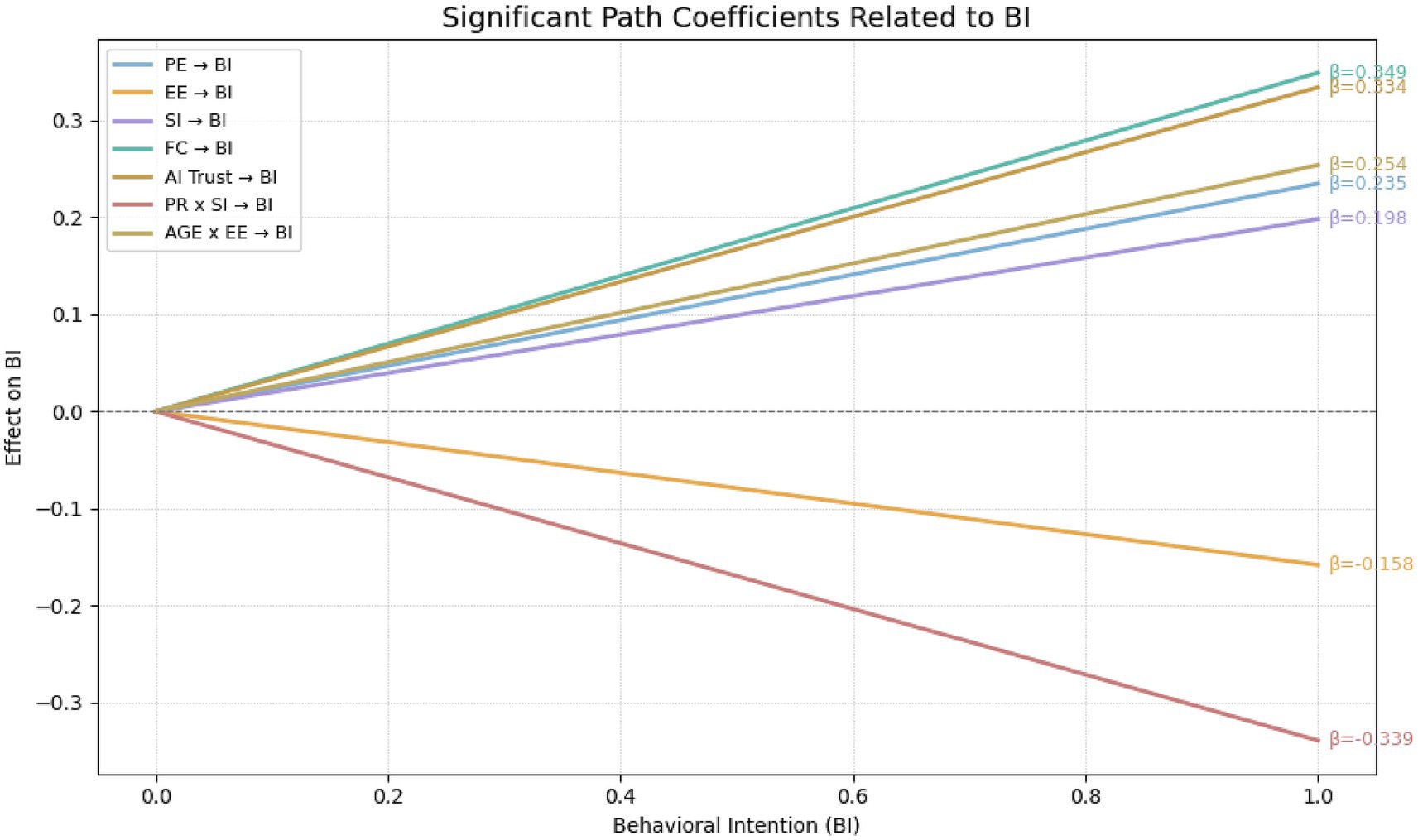 Bootstrapping with 5,000 resamples was utilized to calculate path coefficients and determine their significance. Path significance (T-statistic > 1.96 and p-value ideally < 0.05) determined hypothesis support, while the size of path coefficients indicated effect strength. Furthermore, the magnitude of each path coefficient reflects the relative strength of influence exerted by the independent variables on the corresponding dependent construct. The results of the hypothesis testing are summarized in Table 9. Figure 5 presents a bar chart illustrating the standardized β coefficients for each hypothesized path, with color coding used to differentiate between supported and unsupported hypotheses. Additionally, Figure 6 displays simple slope interaction plots, depicting variations in behavioral intention (BI) across different levels of key independent variables. These visualizations offer an intuitive representation of both the strength and directionality of the observed relationships.