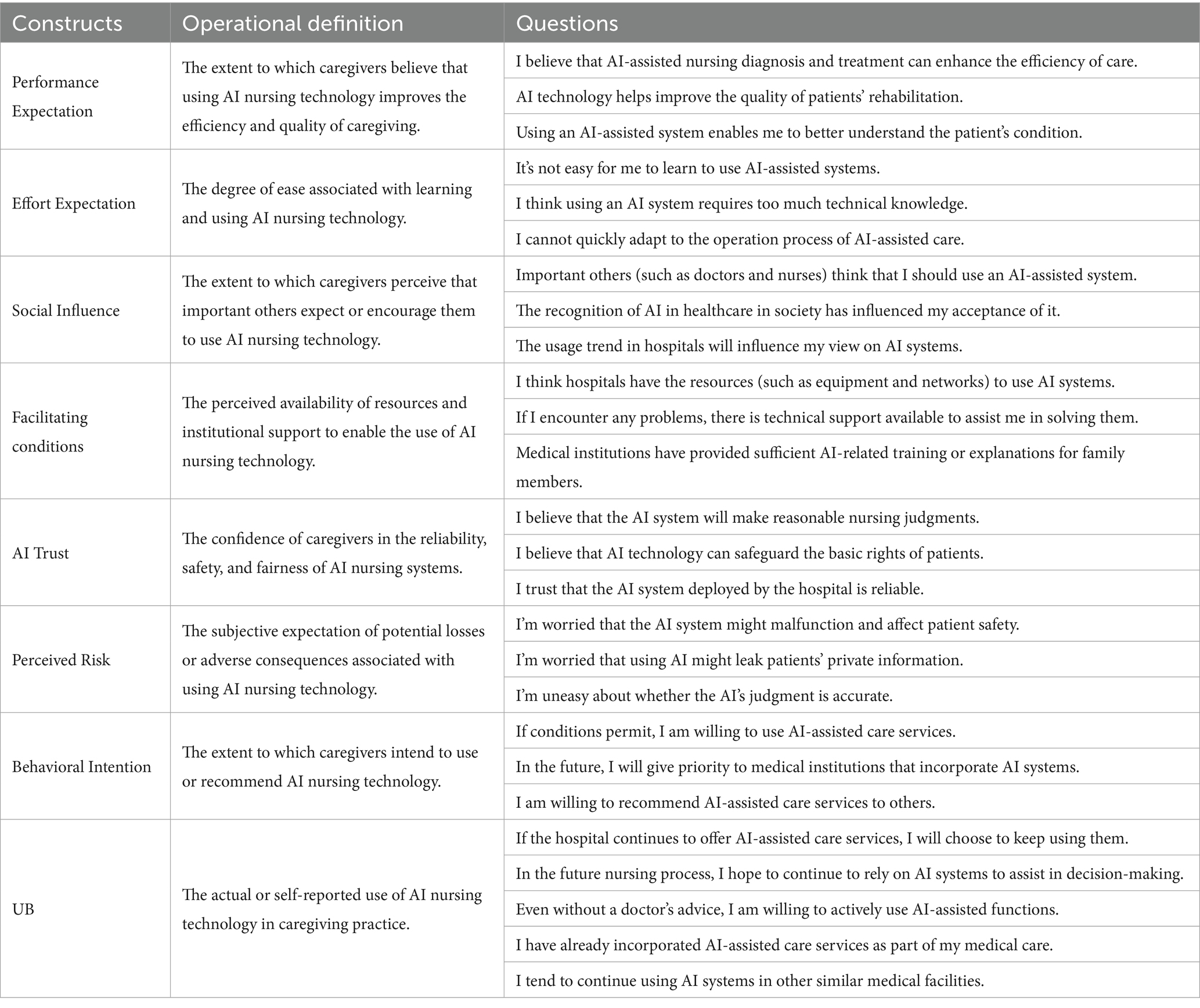 All constructs in this study were measured using reflective multi-item scales adapted from established literature to ensure validity and reliability. The items were rated on a five-point Likert scale ranging from 1 (strongly disagree) to 5 (strongly agree). To enhance comprehension among family caregivers—who may be unfamiliar with specific AI technologies—we provided a clear explanation in the survey introduction: “AI nursing technologies refer to intelligent systems or devices that assist in older adults care, such as health monitoring sensors, medication reminders, emergency alert systems, or companion robots.” Detailed operational definitions and measurement items for each construct are provided in the Table 1.