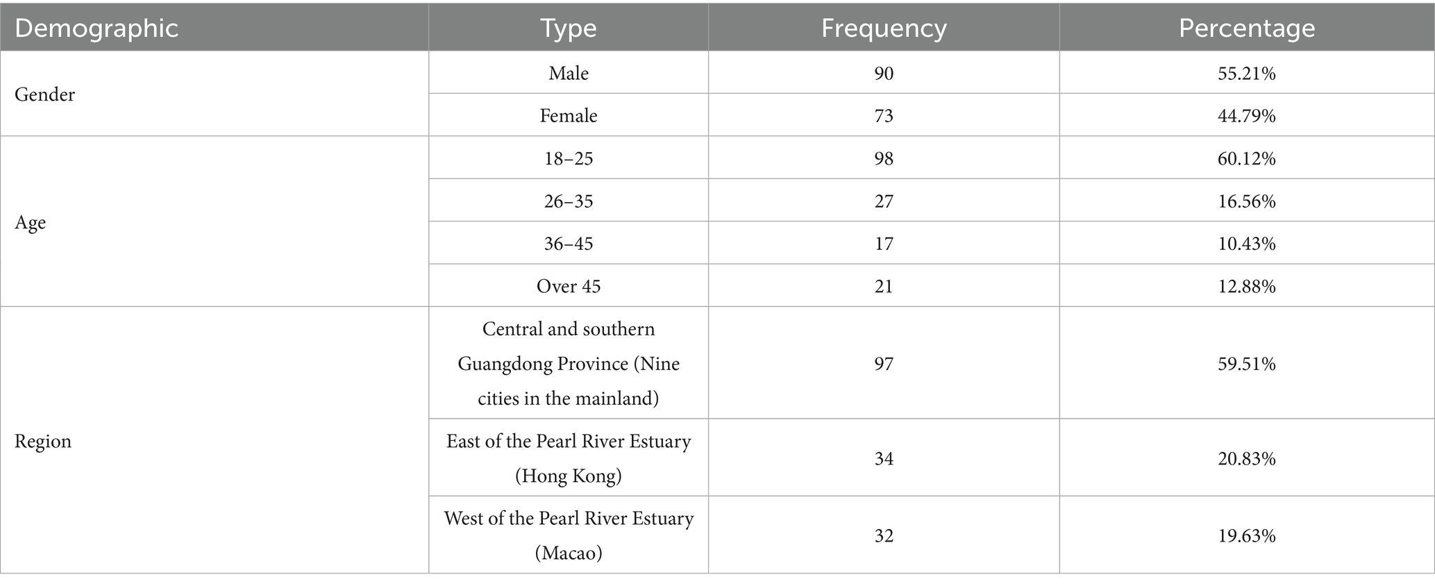Given the methodological requirements for structural equation modeling (SEM), psychological avoidance tendencies among caregiver populations, and the necessity for stable parameter estimates and adequate statistical power, the study aimed for at least 150 valid questionnaires. In May 2024, questionnaires were distributed throughout the Greater Bay Area. After eliminating incomplete or severely flawed responses, 163 valid samples remained for quantitative analysis. To enhance questionnaire design and clarity, the research team conducted brief supplementary interactions after questionnaire completion in select cases, involving short (1–2 min) follow-up questions such as “Which questions did you find difficult?” or “Did any options seem inconsistent with your actual experiences?” These interactions were neither audio-recorded nor thematically analyzed but rather served to verify item clarity and rationality for future questionnaire refinements; they were excluded from formal data analysis (Table 2).