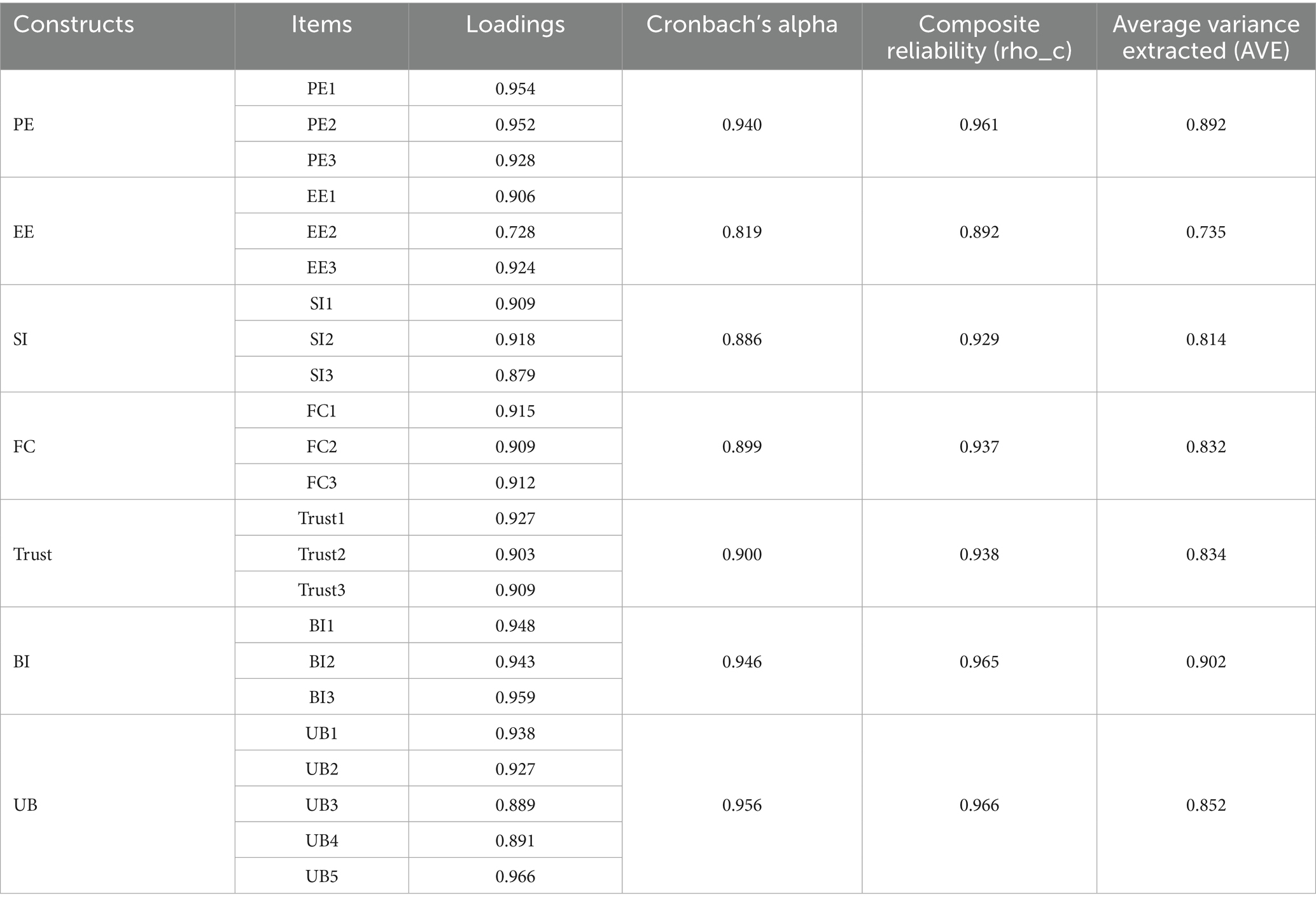 Overall, the measurement model exhibited ideal levels of reliability, convergent validity, and discriminant validity. Empirical data showed that Cronbach’s alpha coefficients for all latent variables exceeded the acceptable threshold of 0.7, confirming excellent internal consistency and reliability (44). AVE values were all above 0.5, confirming convergent validity. Additionally, discriminant validity was confirmed by each construct’s square root of AVE being significantly higher than its correlations with other constructs, satisfying the Fornell-Larcker criterion (41).