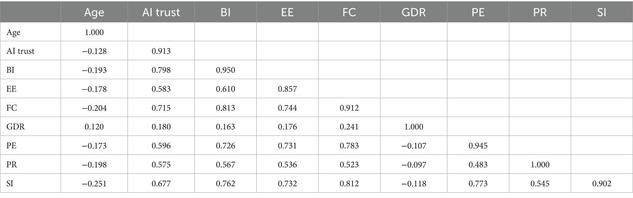 Validity was evaluated through convergent validity and discriminant validity assessments. Convergent validity was assessed using Average Variance Extracted (AVE). As indicated in Table 3, all variables demonstrated AVE values exceeding the threshold of 0.5. Cronbach’s alpha values between 0.6 and 0.7 typically represent acceptable reliability (42). Behavioral Intention had the highest AVE (0.902). Discriminant validity was assessed based on the Fornell-Larcker criterion by comparing the square roots of AVE values with the correlation coefficients between variables (Table 4). All latent variables met discriminant validity requirements, consistent with Hair et al.’s recommendations for systematic PLS modeling (43).