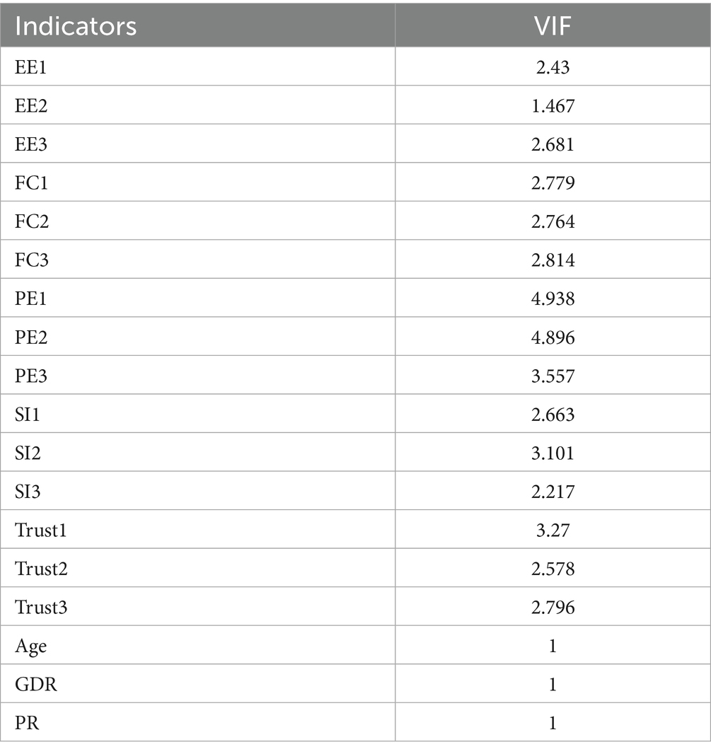All latent variables in this study had VIF values below 5, confirming the absence of serious multicollinearity and validating the questionnaire’s construct settings. This result further indicates that questionnaire items effectively distinguished among dimensions, thus minimizing biases and distortions from multicollinearity.