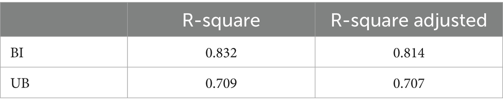 The results indicated a high explanatory power for behavioral intention (BI), with R2 = 0.832, significantly exceeding the typical UTAUT benchmark of 50–60%. This demonstrates that core predictors, such as performance expectancy and effort expectancy, explained 83% of the variance in behavioral intentions toward AI nursing applications. The adjusted R2 value (0.814), accounting for degrees of freedom, further underscored model robustness. Usage behavior (UB) had an R2 of 0.709 and an adjusted R2 of 0.707, showing that the model maintained strong explanatory power even after accounting for control variables and interaction effects.
