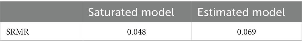 Model fit was evaluated using the Standardized Root Mean Square Residual (SRMR). According to Henseler and Sarstedt (45), an SRMR value should be below 0.14. Analysis revealed that the SRMR value of the saturated model was 0.048, and the SRMR value of the estimated model was 0.069 (Table 7). Both values were significantly below the threshold, indicating acceptable model fit.