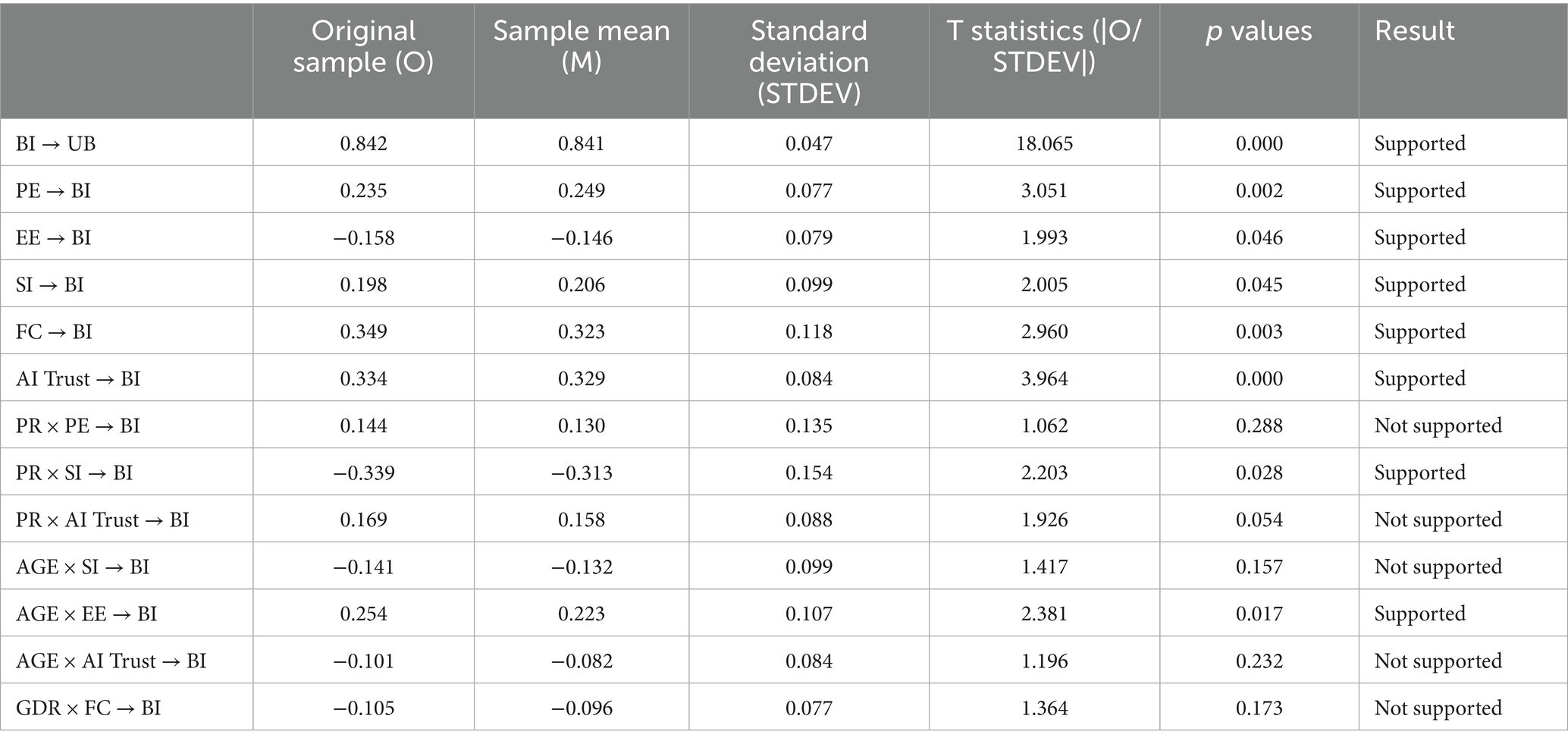 Perceived Risk did not significantly moderate Performance Expectancy (H6a: β = 0.144, t = 1.062, p = 0.288), possibly due to institutional risk management in the Greater Bay Area (e.g., insurance, review mechanisms). The moderation effect of PR on AI Trust (H6c: β = 0.169, t = 1.926, p = 0.054) approached significance, suggesting potential clinical implications, possibly influenced by trust calibration mechanisms (46). Age did not significantly moderate the influence of SI on BI (H7b: β = −0.141, t = 1.417, p = 0.157), possibly due to older nurses prioritizing emotional goals over social evaluations. Similarly, Age did not significantly moderate AI Trust’s effect on BI (H7c: β = −0.101, t = 1.196, p = 0.232), perhaps reflecting heightened cognitive vigilance among older professionals in high-risk healthcare contexts. Gender’s moderating effect on FC (H8: β = −0.105, t = 1.364, p = 0.173) was not significant, likely reflecting diminished gender differences due to professional identity and widespread digital literacy.