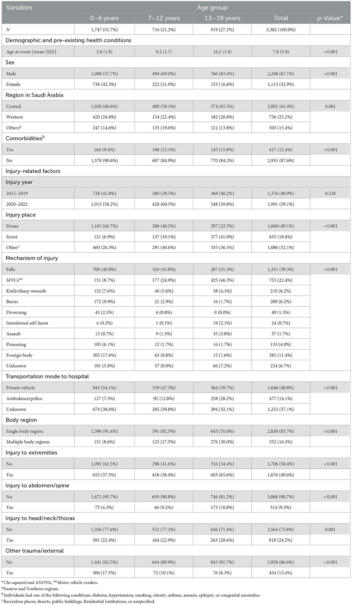 In Saudi Arabia, injuries were responsible for 82.5% of all preventable deaths among children (8). Studies showed that infants had a higher prevalence of injuries compared to other age groups, and more frequent, severe, and fatal injuries were associated with suspected child abuse (9, 10). Drowning most commonly affected 6–12-year-olds (8). The leading cause of injury-related mortality was road traffic injuries, accounting for 60.6% of these deaths, particularly among 13–18-year-olds (8). Additionally, research from a trauma center in Riyadh found that older patients (>14 years of age) were predominantly male, more likely to be involved in traffic-related injuries, and sustained more severe injuries compared to patients younger than 14 years (11).