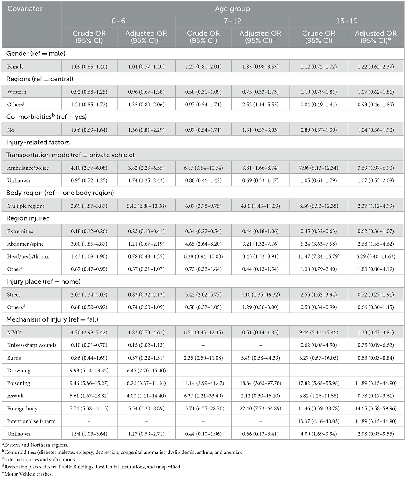 Table 2 explores the crude and adjusted ORs of severe injury characteristics for the age group 0–19.