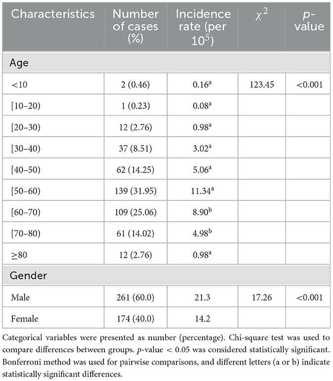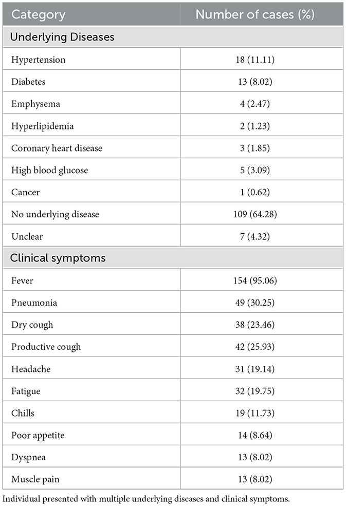 The demographic characteristics of the reported cases were shown in Table 1. Among the 435 cases, there were 261 male and 174 female, with a male-to-female ratio of 1:0.67. The incidence rate in males was higher than in females (χ2 = 17.26, p < 0.001) (Table 1). The ages of the cases ranged from 3 to 93 years old, with a median age of 58. The incidence rates in the 50–60 and 60–70 age groups were higher than those in other age groups (Table 1). Of the 162 cases successfully follow-up, 46 (28.39%) had underlying diseases, 109 (64.28%) did not, and 7 (4.32%) were unclear. The most common symptoms were fever (95.06%) and pneumonia (30.25%) (Table 2). Multivariate regression analysis showed that underlying diseases are positive associated with psittacosis pneumonia [OR (95% CI) = 2.47 (1.42, 3.31)]. Compared to cases without psittacosis pneumonia, patients with underlying conditions are more likely to develop complications such as pneumonia after being infected with the psittacosis pathogen (Figure 3).