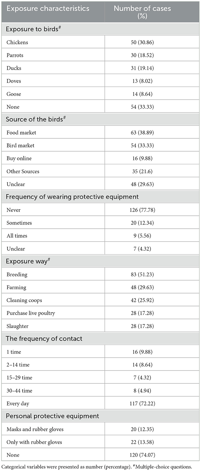 Among the 162 cases, 108 cases (66.67%) had a history of bird epidemiological exposure, while the remaining 54 cases (33.33%) did not. An analysis of the 108 cases with poultry exposure revealed that the most common exposure animals were chickens (30.86%), parrots (18.52%), and ducks (19.14%). The most common sources of poultry exposure were food market (38.89%) and bird markets (33.33%). The most common exposure methods were breeding (51.23%), farming (29.63%), and cleaning coops (25.92%). Notably, 77.78% of the cases did not use protective measures when in contact with poultry. Only 29 cases (17.90%) reported using protective measures, 20 cases simultaneously wearing masks and rubber gloves, while 22 cases only wear rubber gloves (Table 3).
