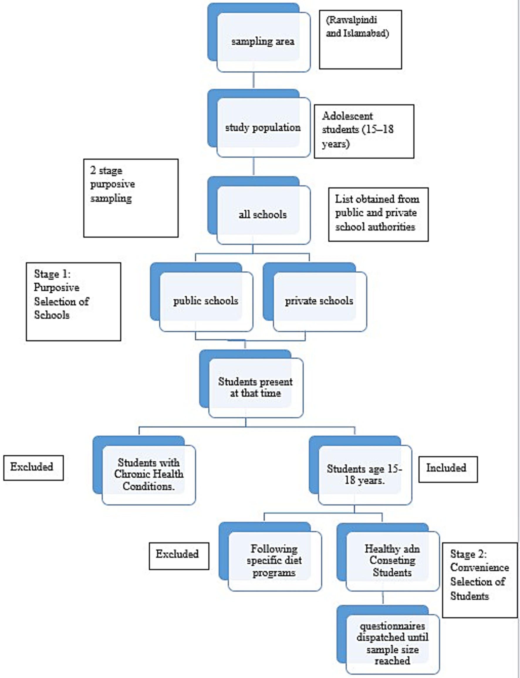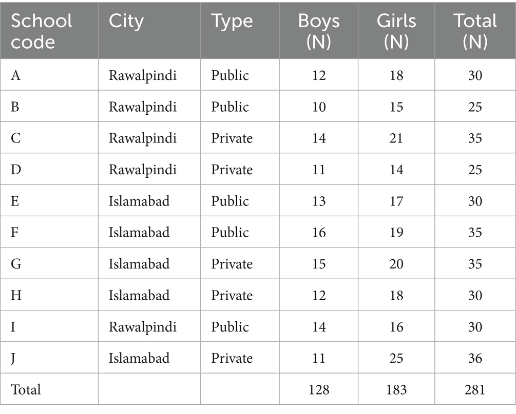 As shown in Figure 1, this study employed a two-stage purposive sampling technique. In the first stage, schools were purposively selected based on accessibility and willingness to participate. As shown in Table 1, a total of 10 schools were included: five public and five private, distributed across Rawalpindi and Islamabad to capture both urban and suburban representation. In the second stage, a convenience sampling approach was applied within each selected school (28). Students aged 15–18 years who were present on data collection days, gave informed consent (and parental consent), and met the study criteria were included.