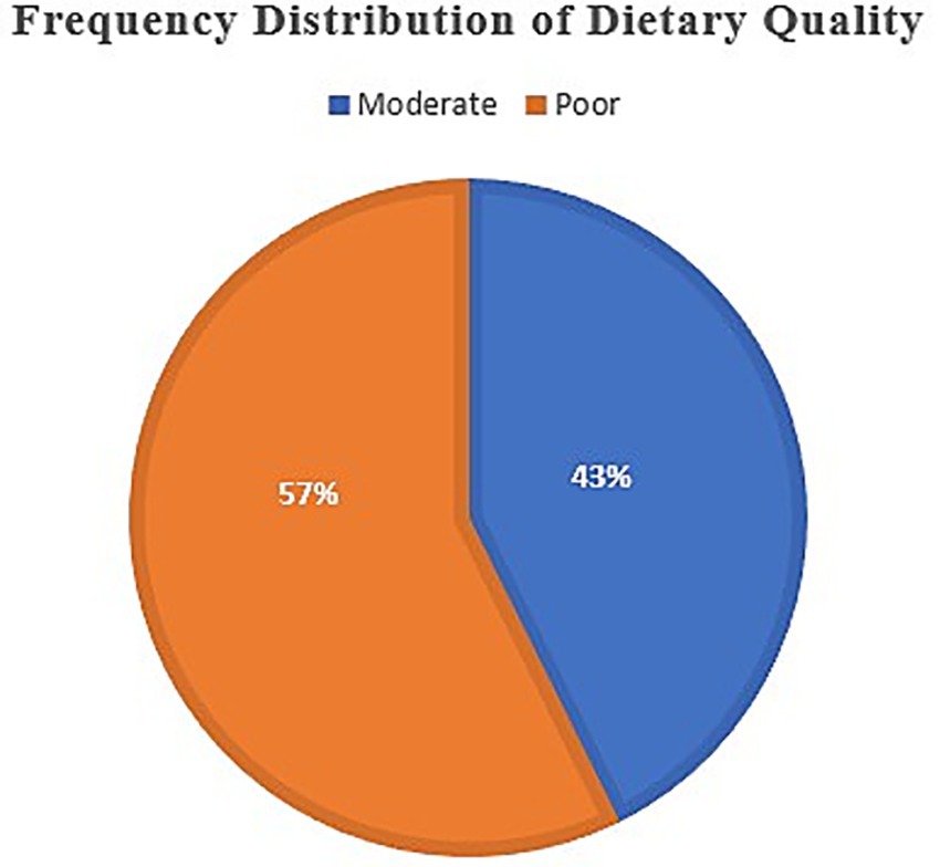 Figure 2. Frequency distribution of dietary quality among adolescents. Among the participants, 57% reported poor diet quality, while 43% reported moderate diet quality. These findings indicate that the majority of adolescents follow suboptimal dietary patterns, reflecting potential risks for academic and health outcomes.