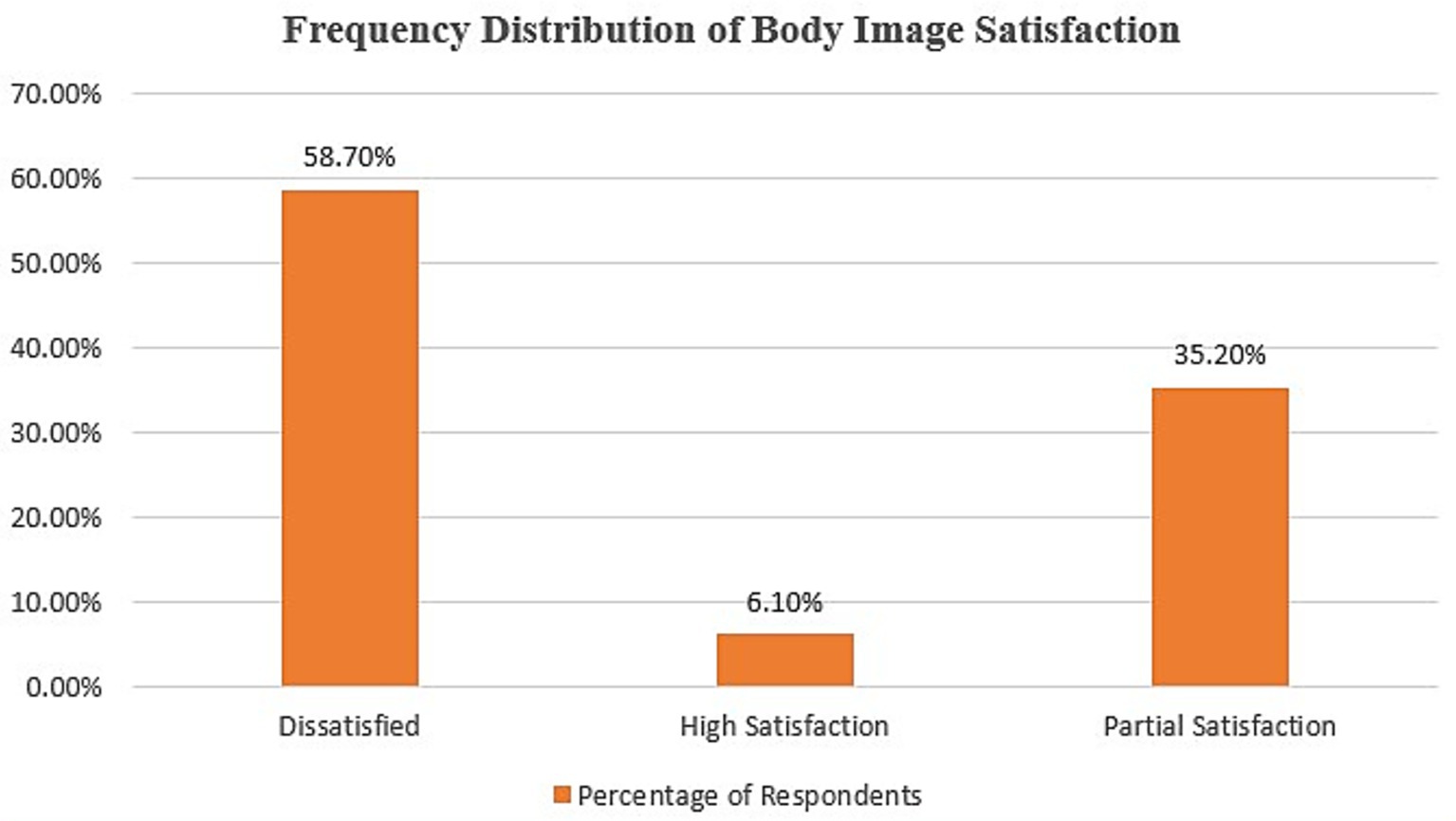 Figure 3. Frequency distribution of body image satisfaction among adolescents. The majority of participants (58.7%) reported dissatisfaction with their body image, while 35.2% expressed partial satisfaction. Only a small proportion (6.1%) indicated high satisfaction, highlighting overall concerns with body image in this population.